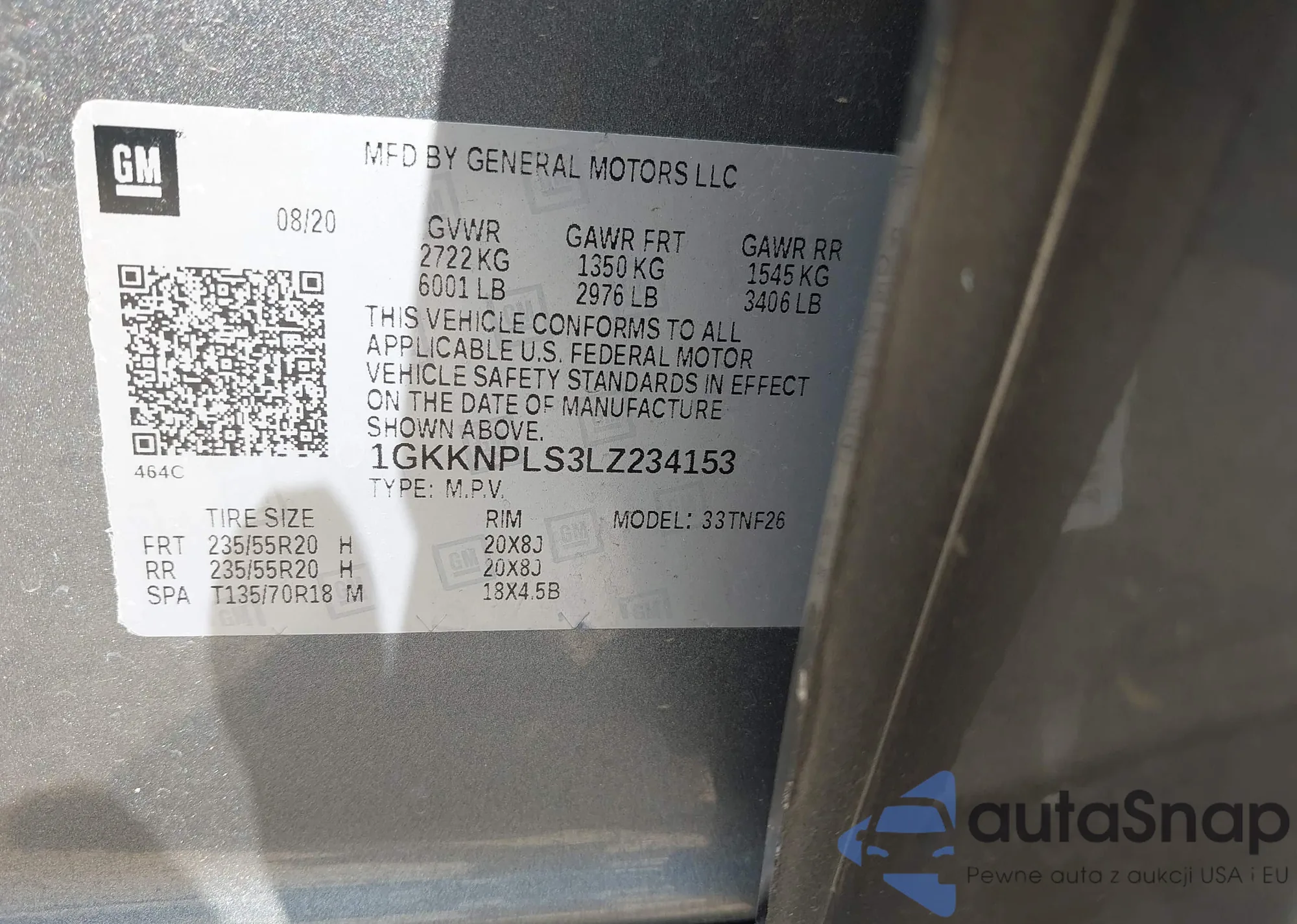 LOT: 43167696 VIN: 1GKKNPLS3LZ234153