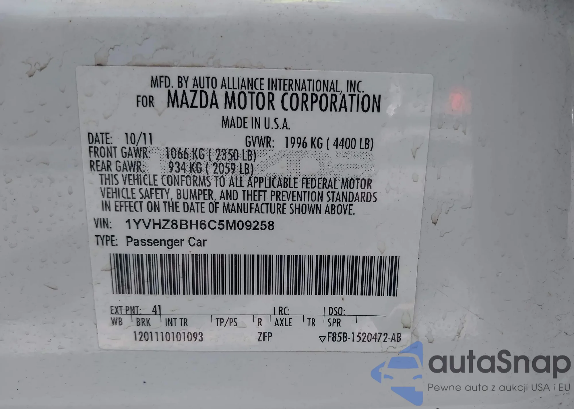 • VIN 1YVHZ8BH6C5M09258