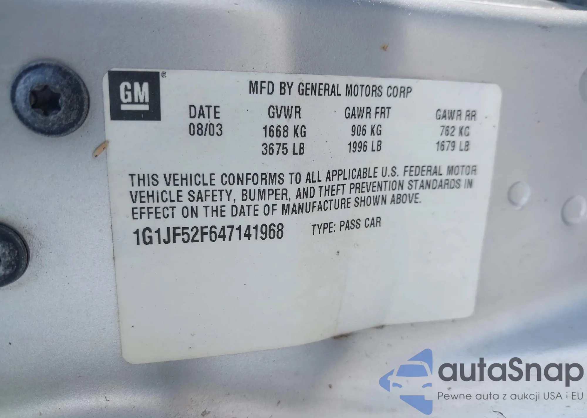 LOT: 43307838 VIN: 1G1JF52F647141968