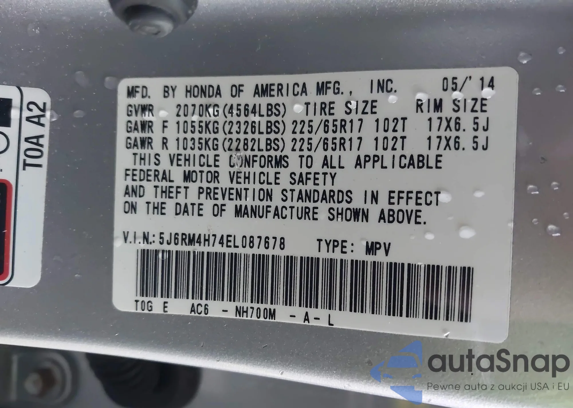 • VIN 5J6RM4H74EL087678