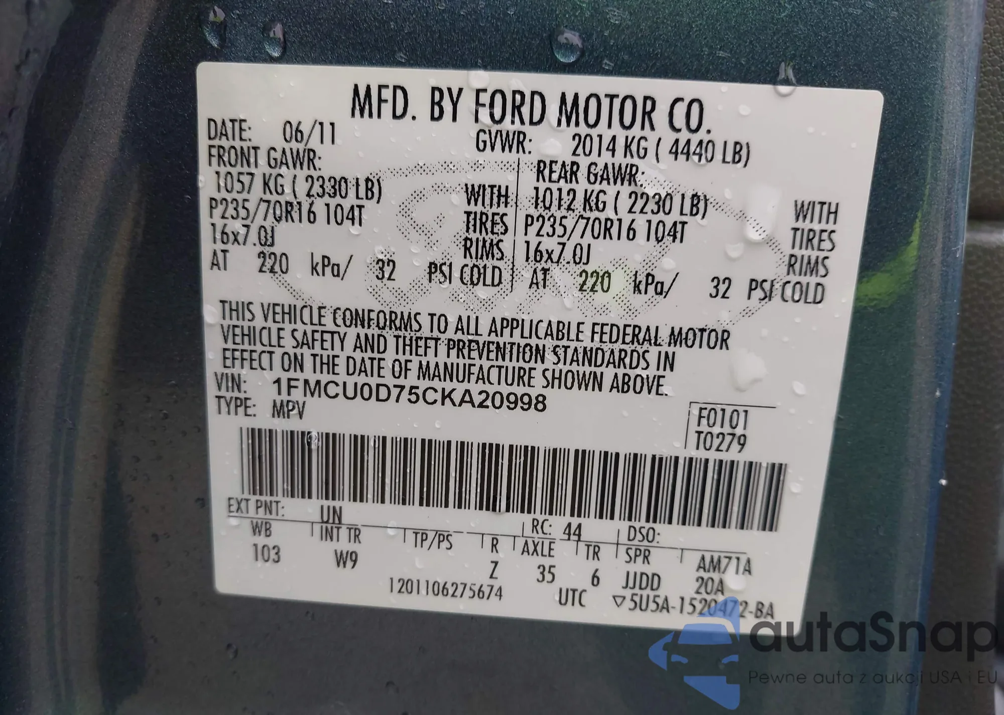 • VIN 1FMCU0D75CKA20998