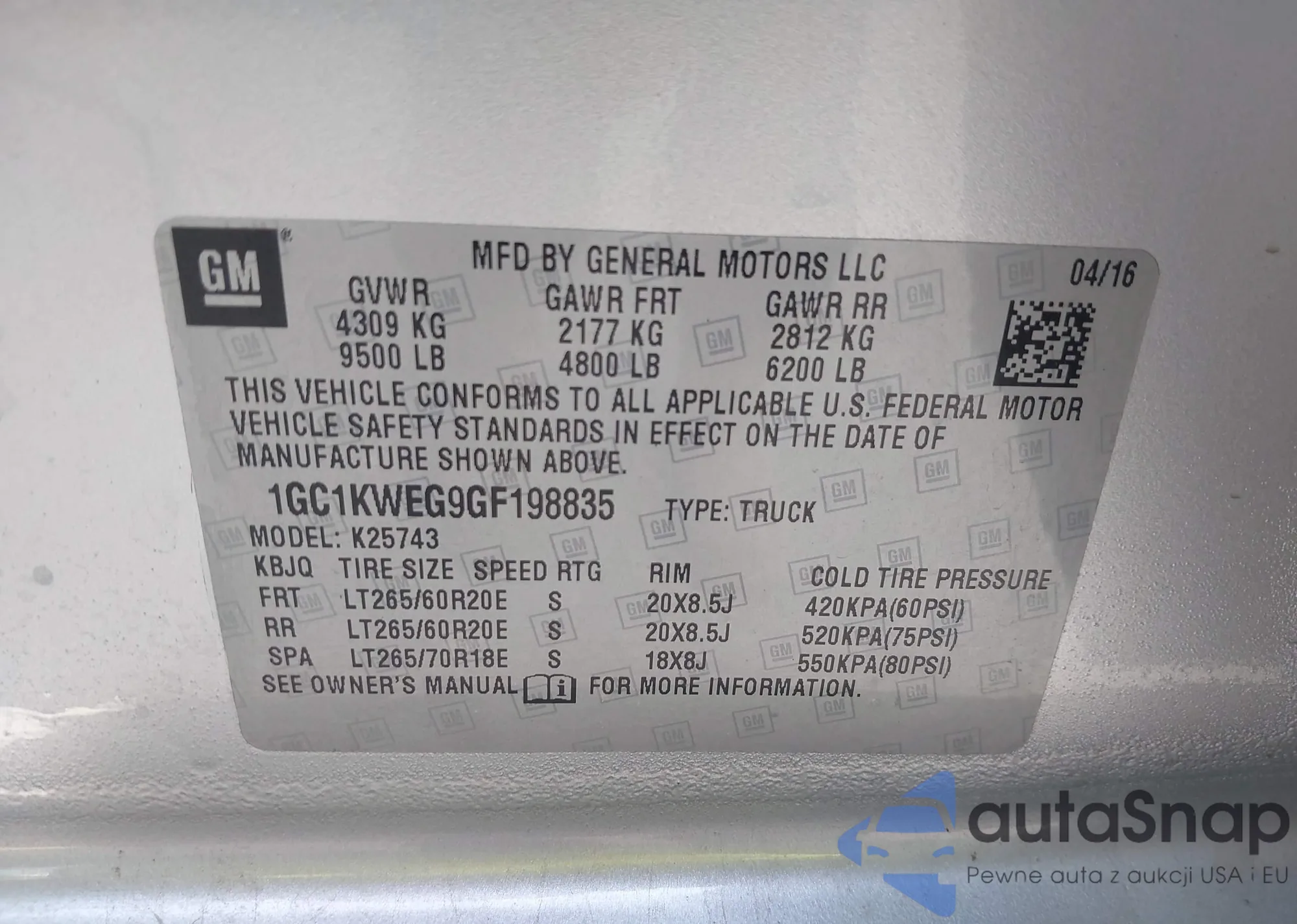 LOT: 43252173 VIN: 1GC1KWEG9GF198835