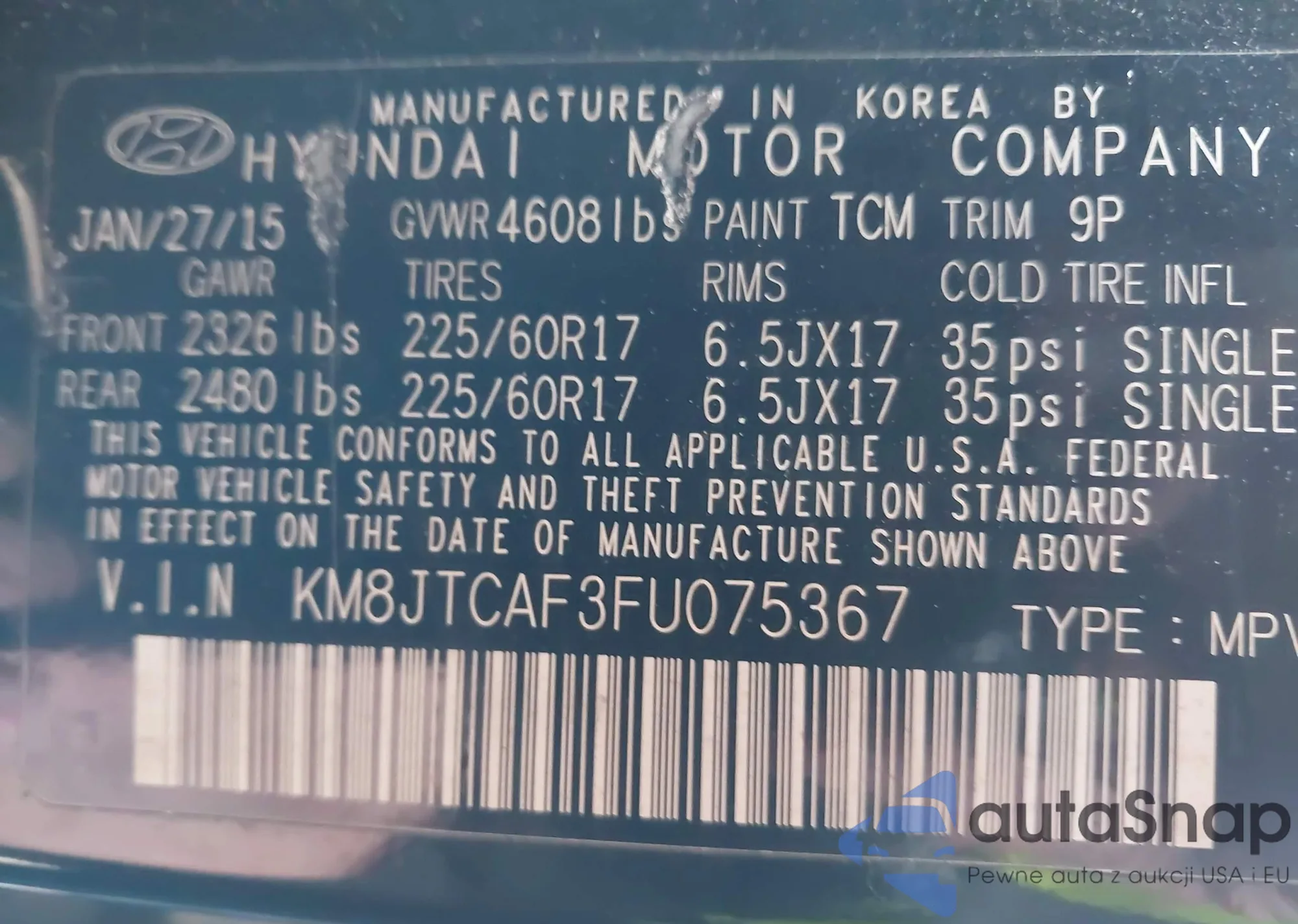 • VIN KM8JTCAF3FU075367