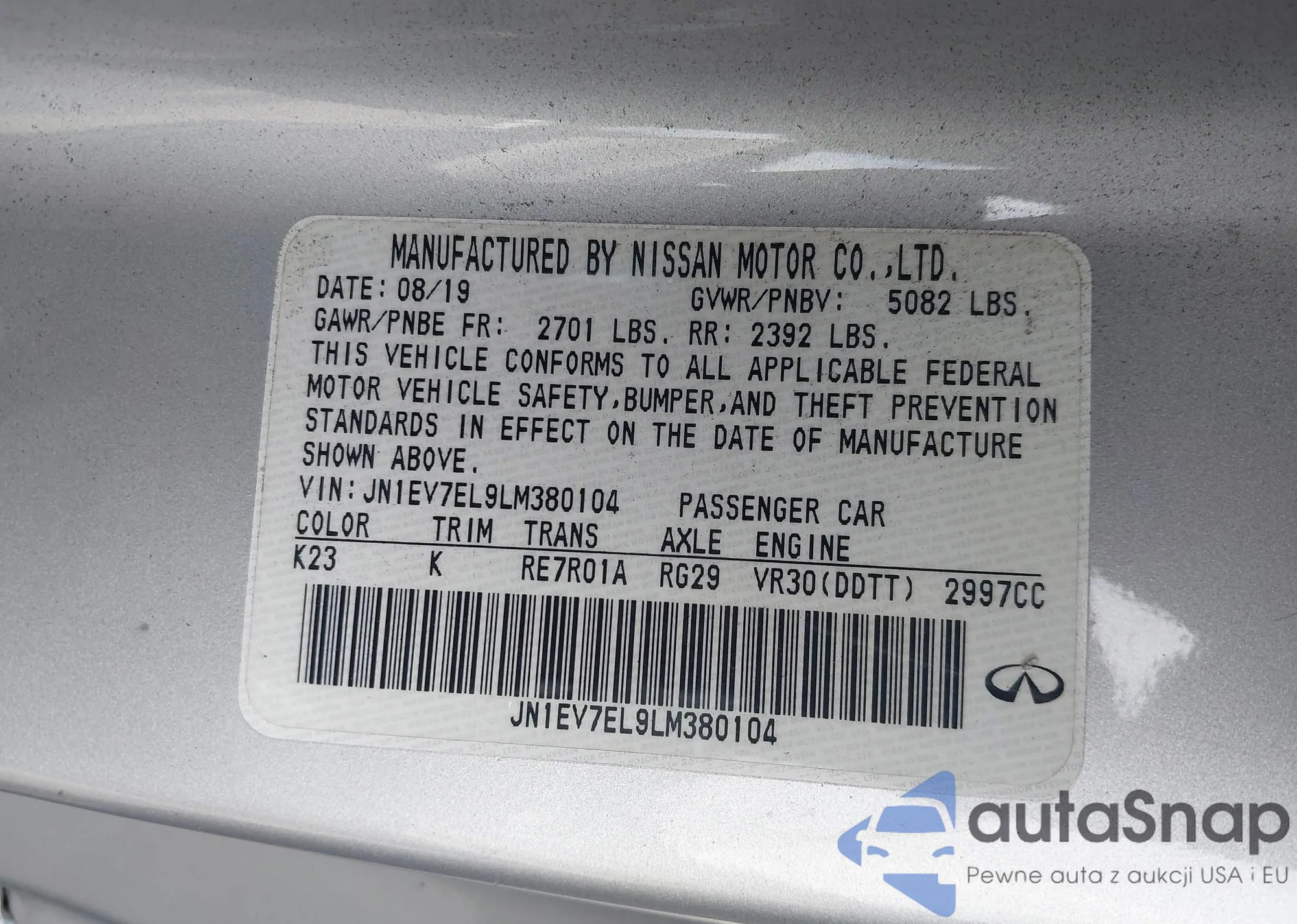 LOT: 43316788 VIN: JN1EV7EL9LM380104