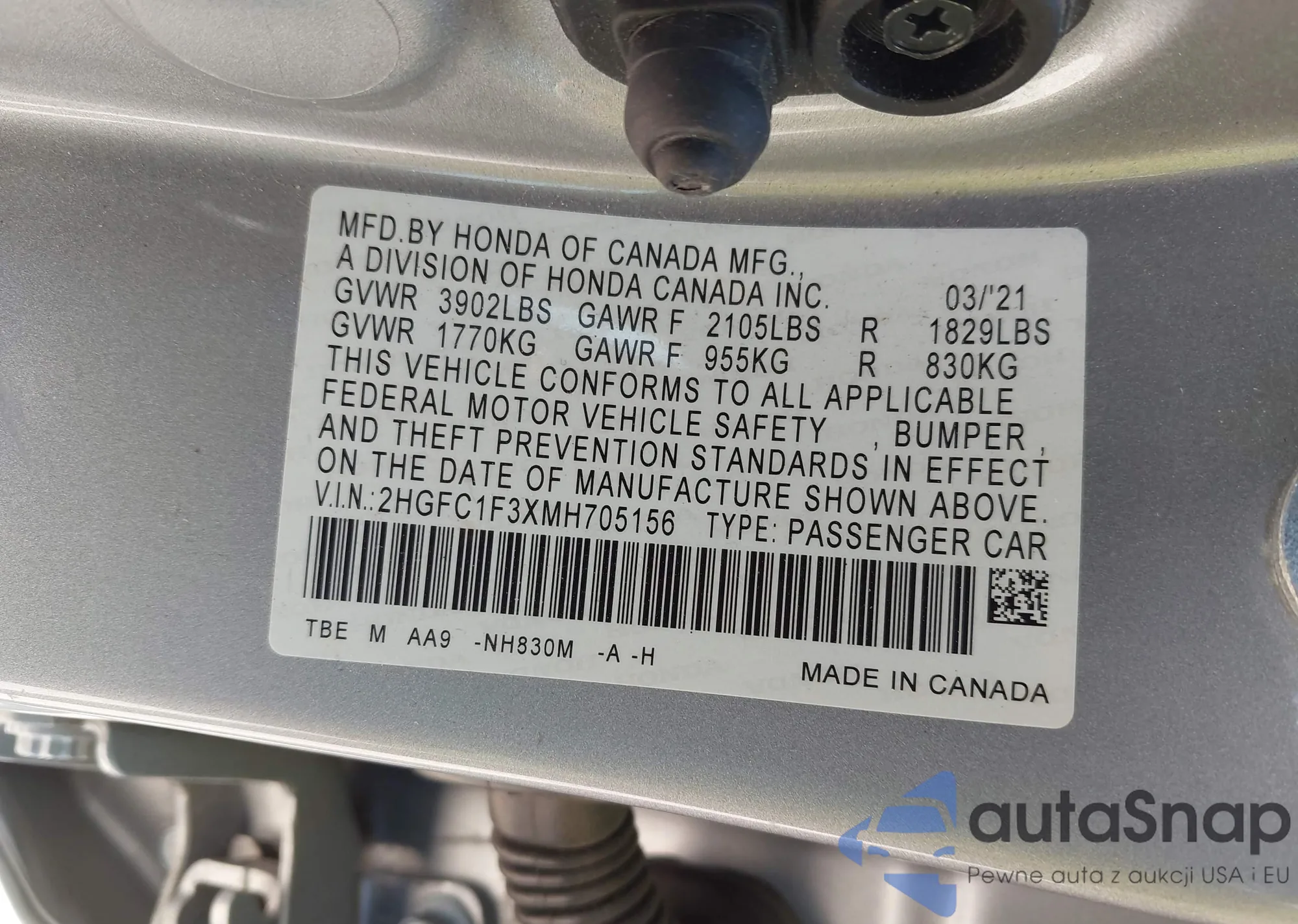 • VIN 2HGFC1F3XMH705156