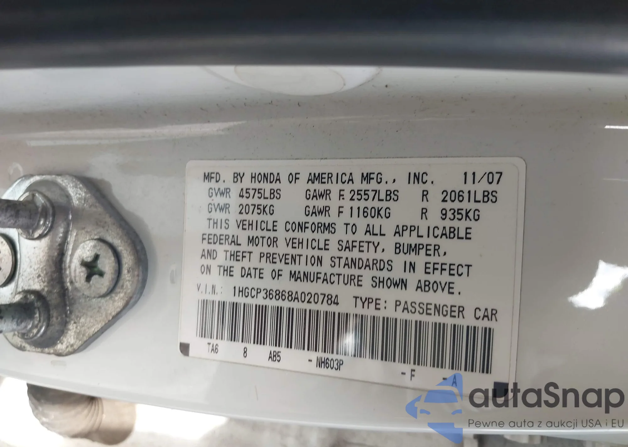 LOT: 43325540 VIN: 1HGCP36868A020784