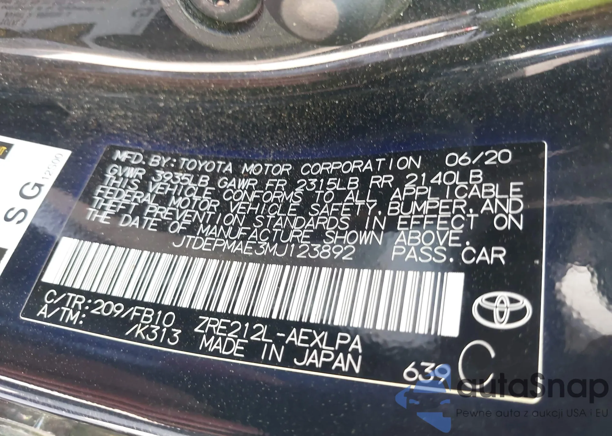 LOT: 43366862 VIN: JTDEPMAE3MJ123892