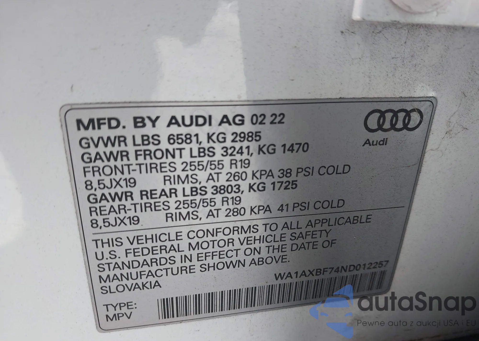 LOT: 43674406 VIN: WA1AXBF74ND012257