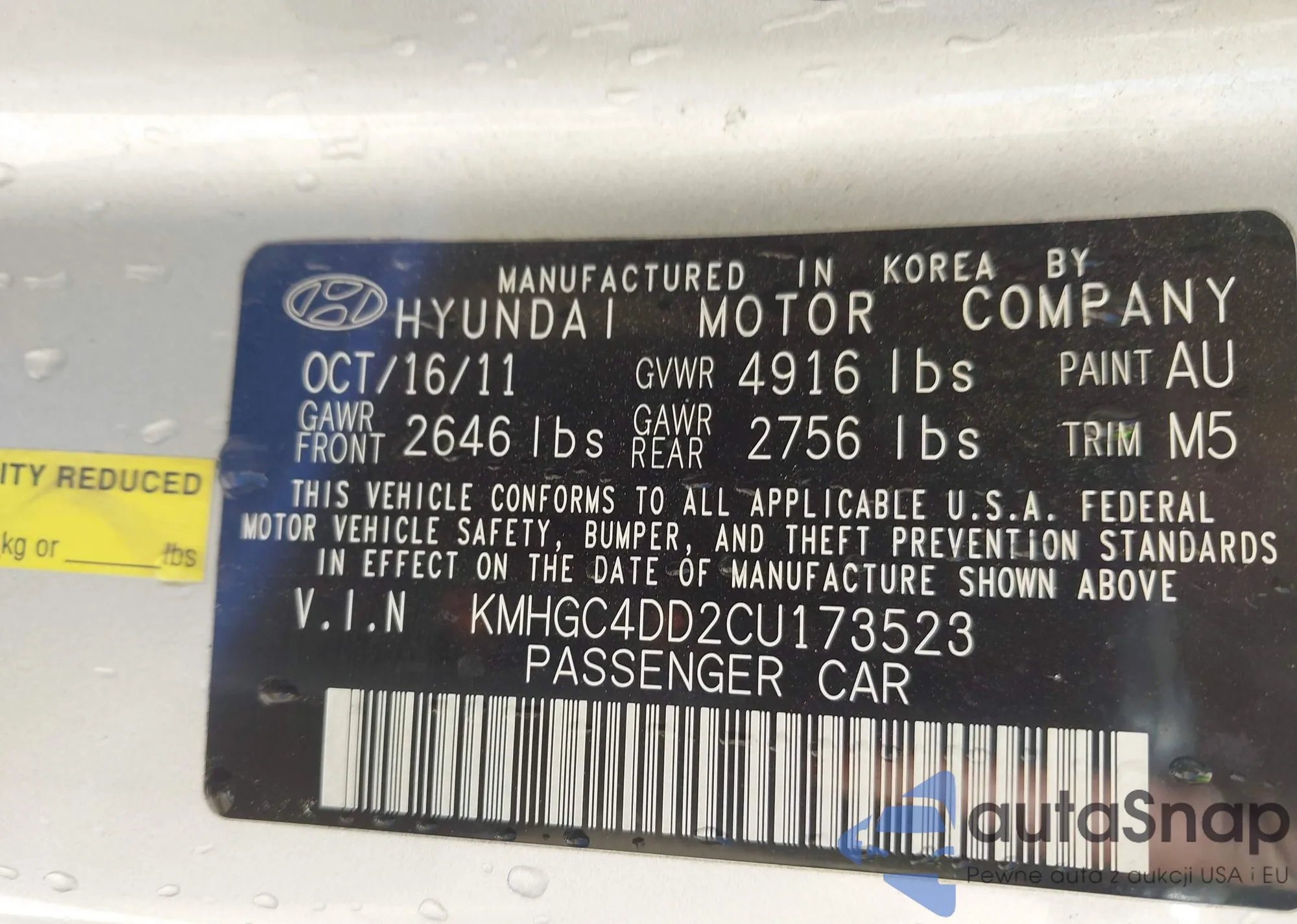 LOT: 43582690 VIN: KMHGC4DD2CU173523