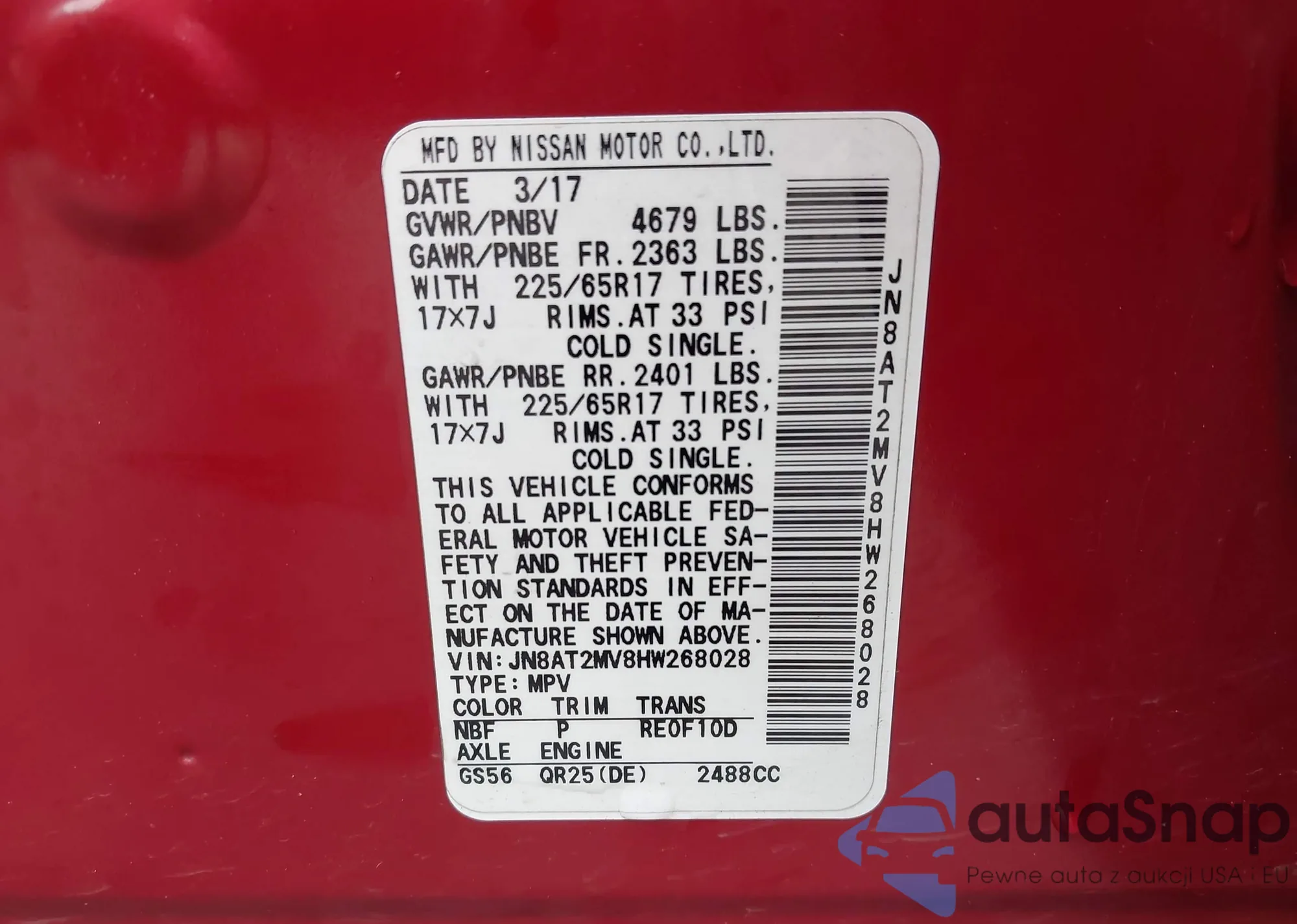 LOT: 43584612 VIN: JN8AT2MV8HW268028