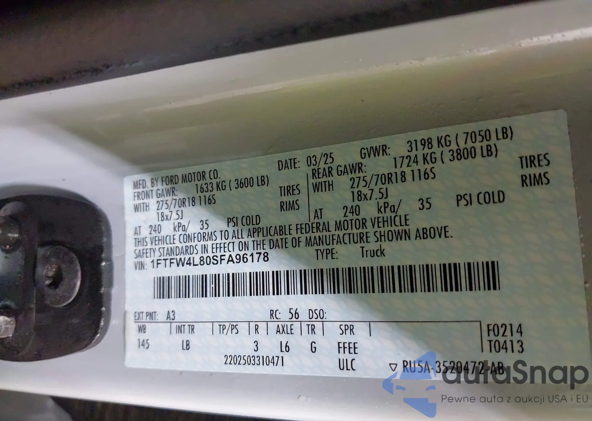 LOT: 43524151 VIN: 1FTFW4L80SFA96178