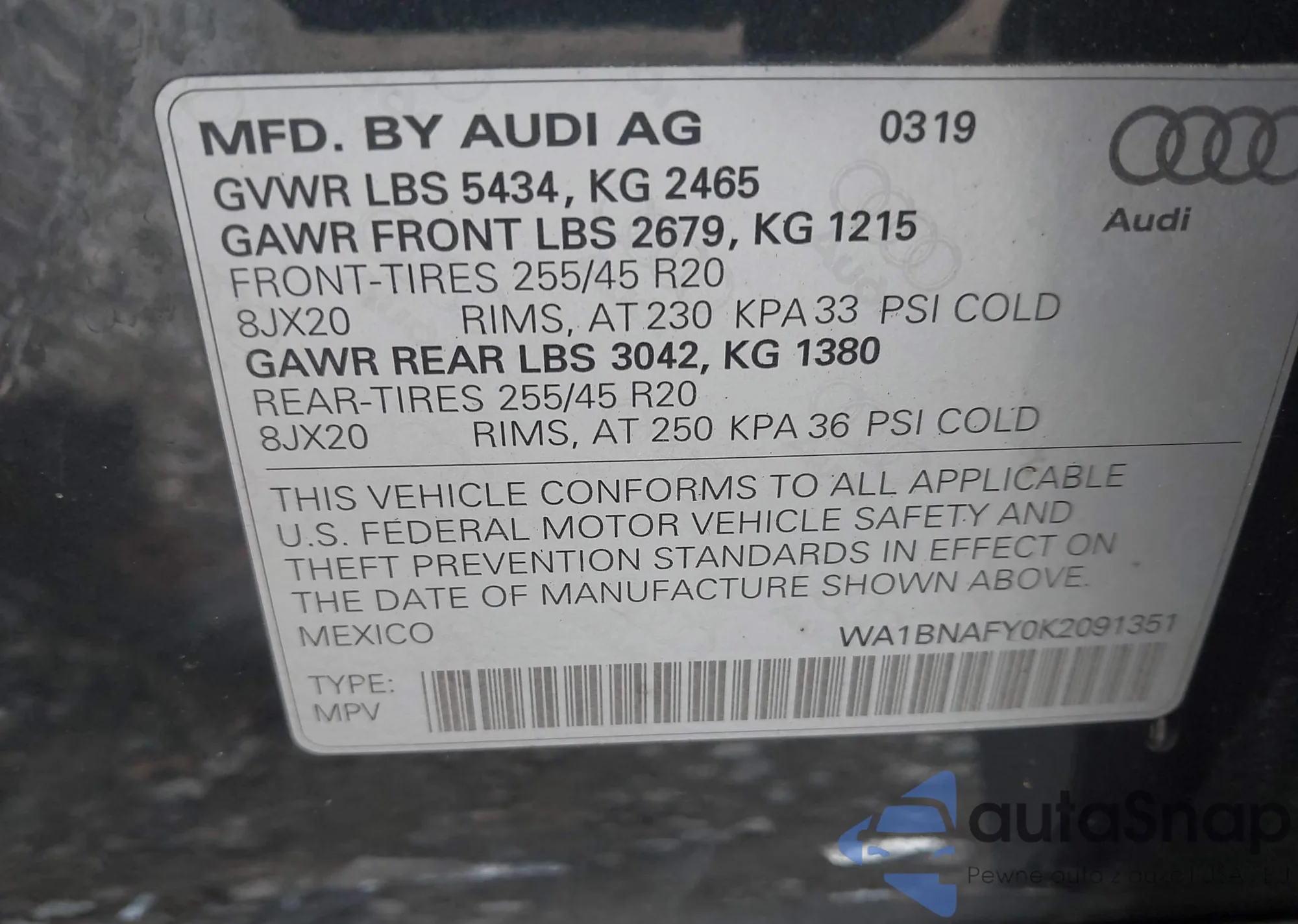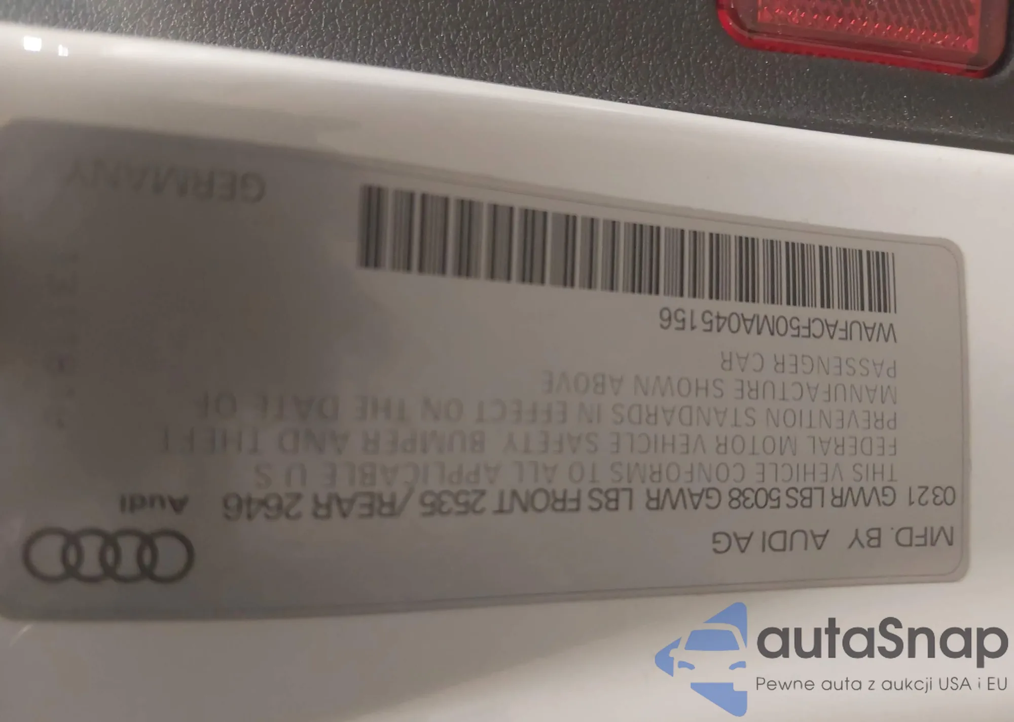 LOT: 41340870 VIN: WAUFACF50MA045156