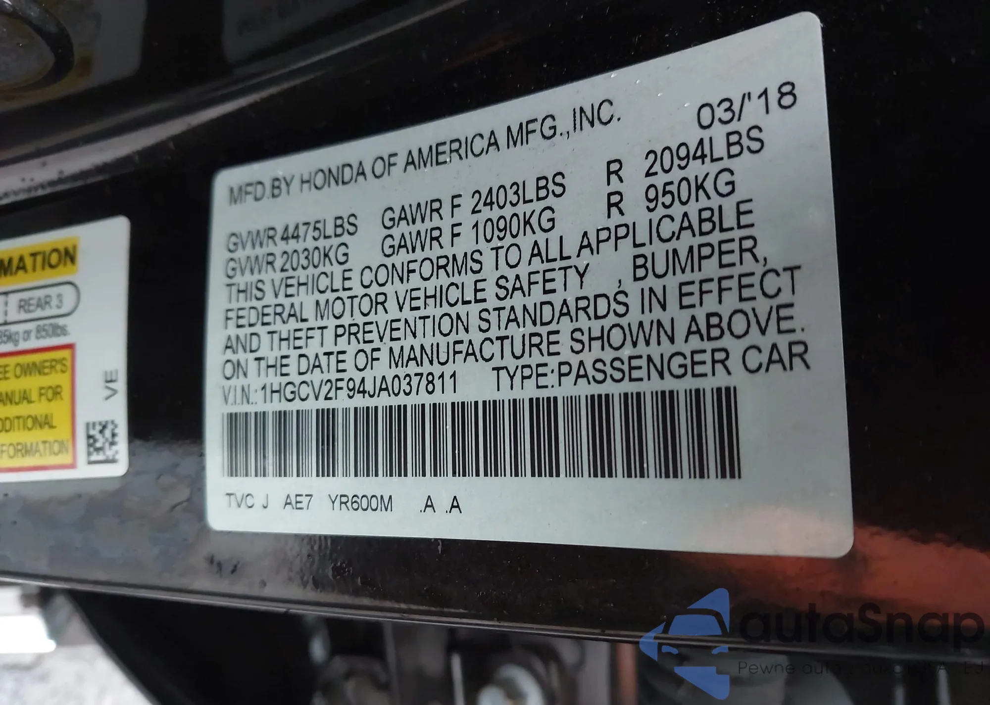 • VIN 1HGCV2F94JA037811