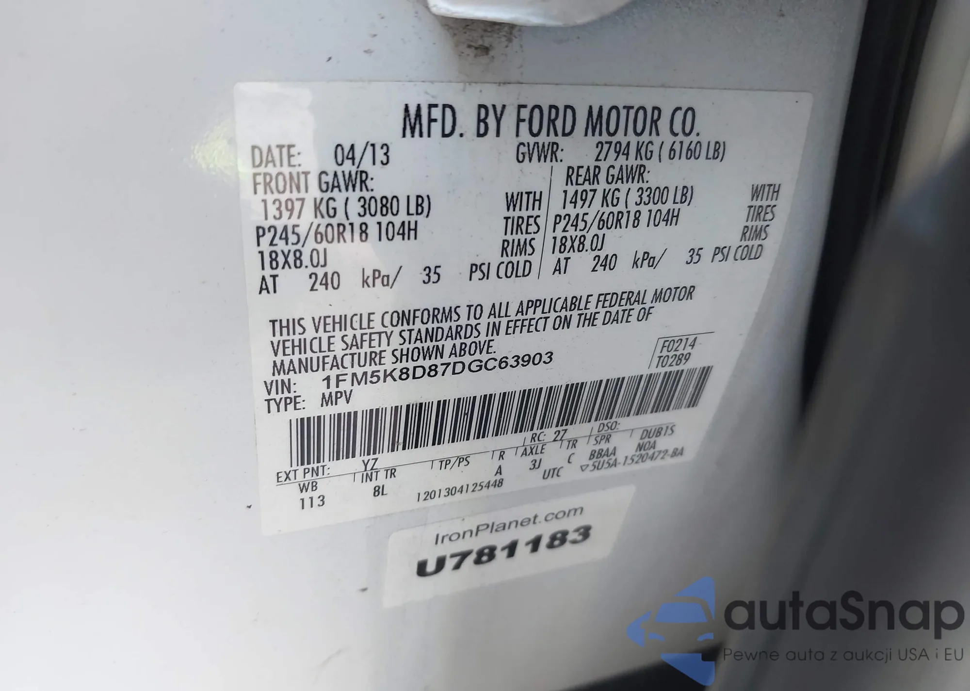 LOT: 43640958 VIN: 1FM5K8D87DGC63903