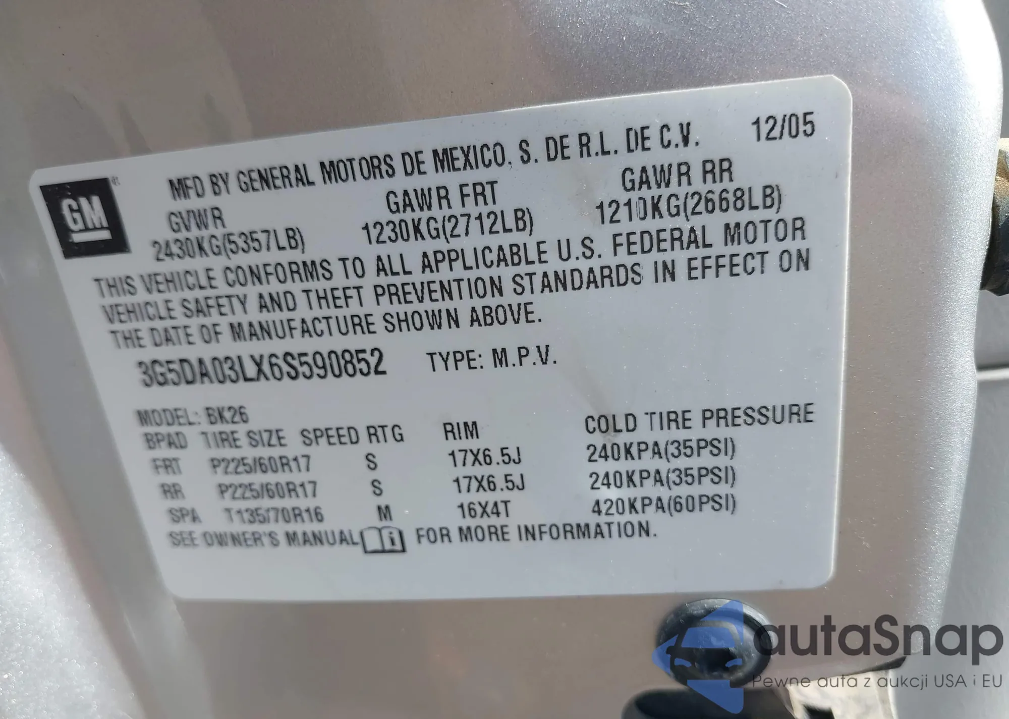 LOT: 43329146 VIN: 3G5DA03LX6S590852