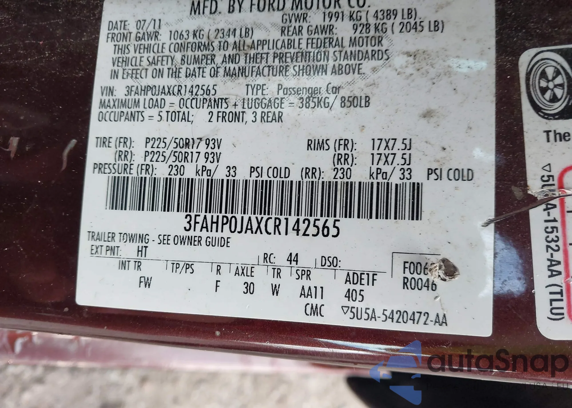 LOT: 42952474 VIN: 1FAHP3F22CL421400