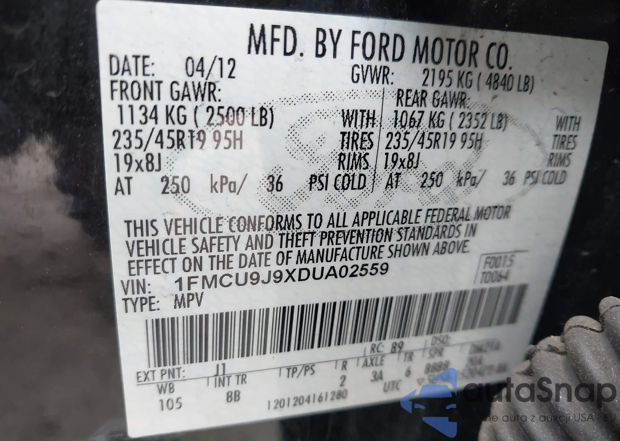 LOT: 43549117 VIN: 1FMCU9J9XDUA02559