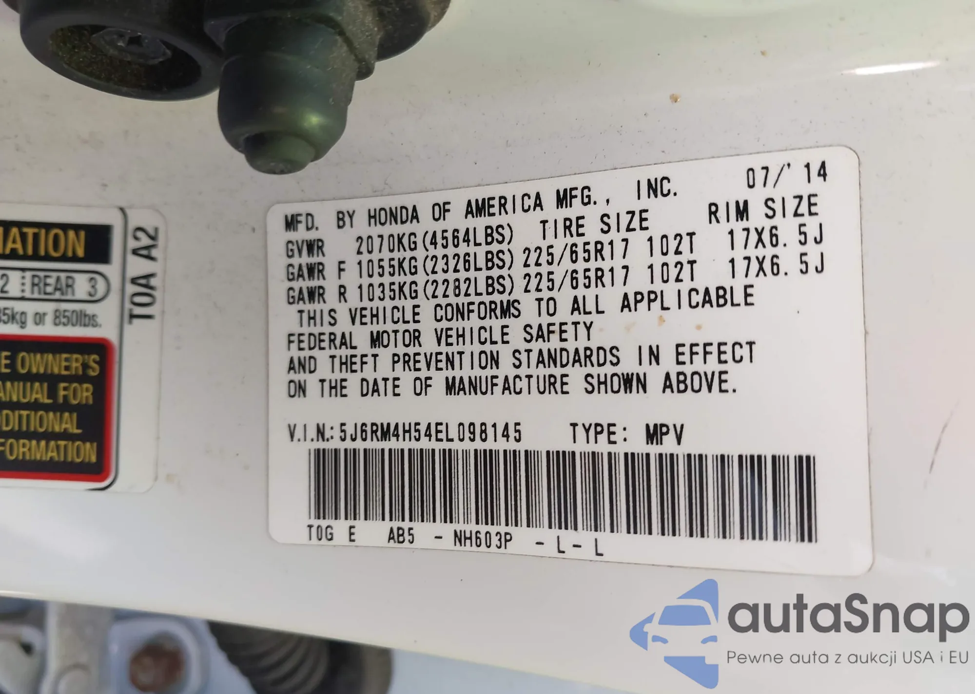 • VIN 5J6RM4H54EL098145