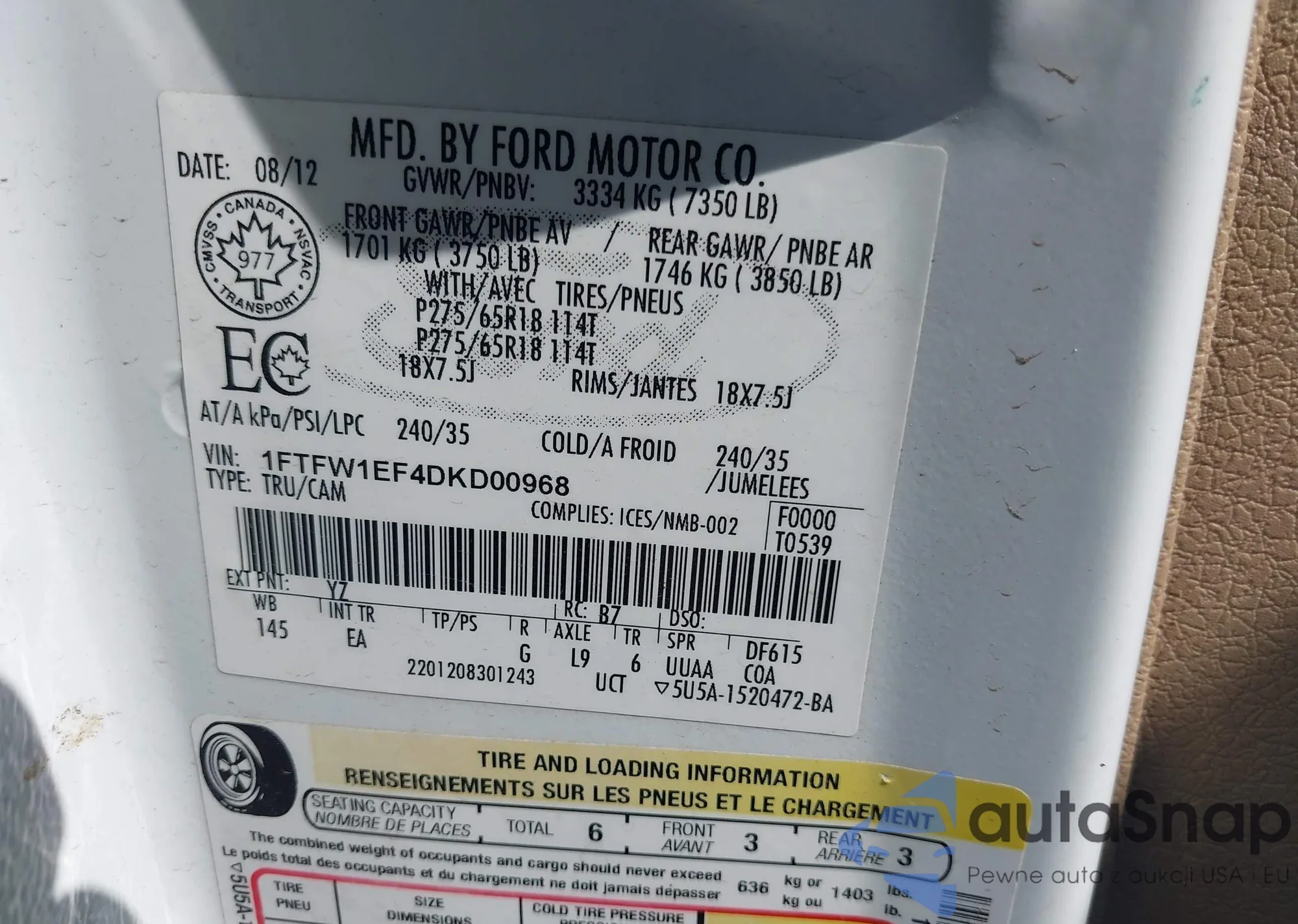 LOT: 43240030 VIN: 1FTFW1EF4DKD00968