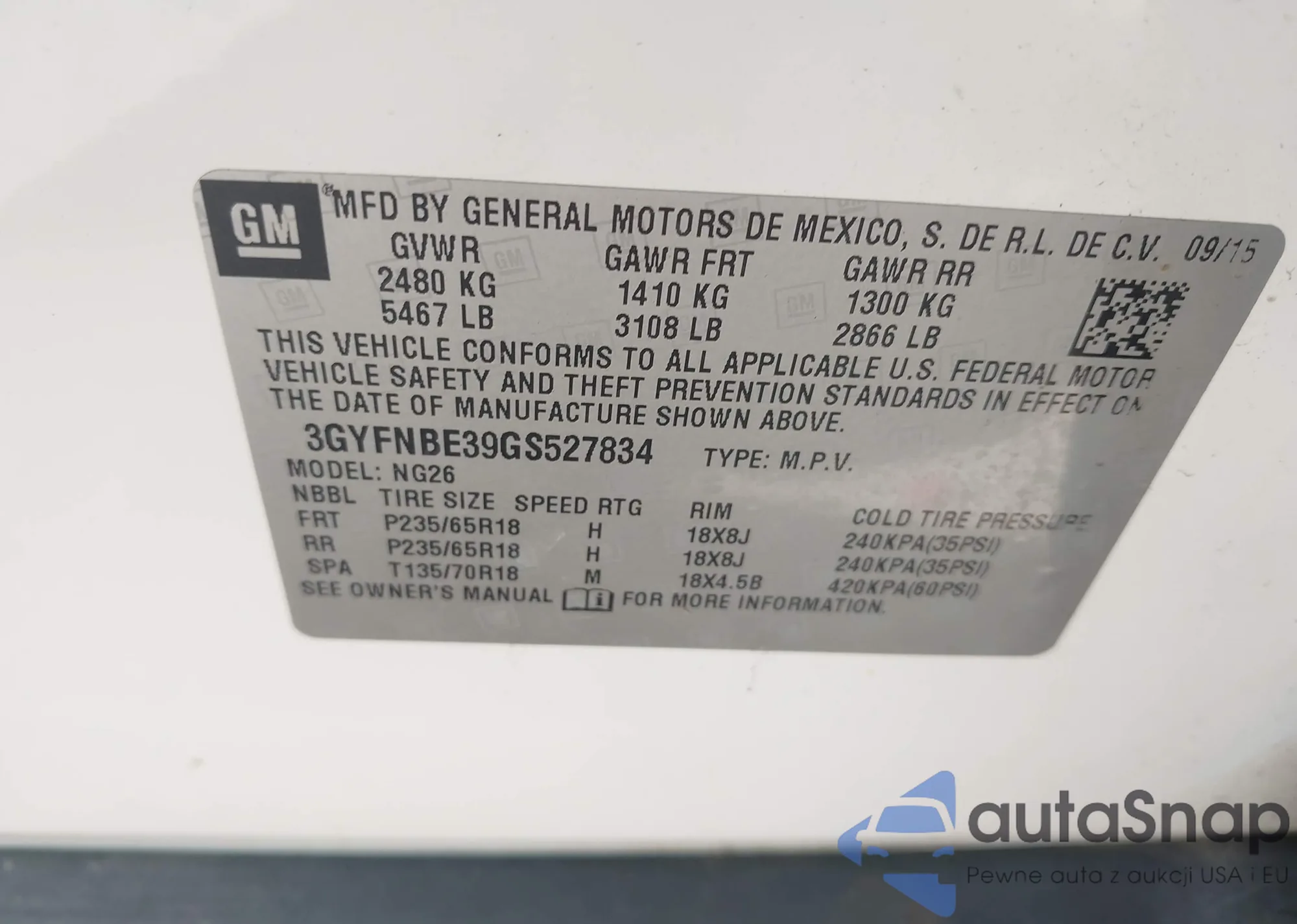 LOT: 43465203 VIN: 3GYFNBE39GS527834