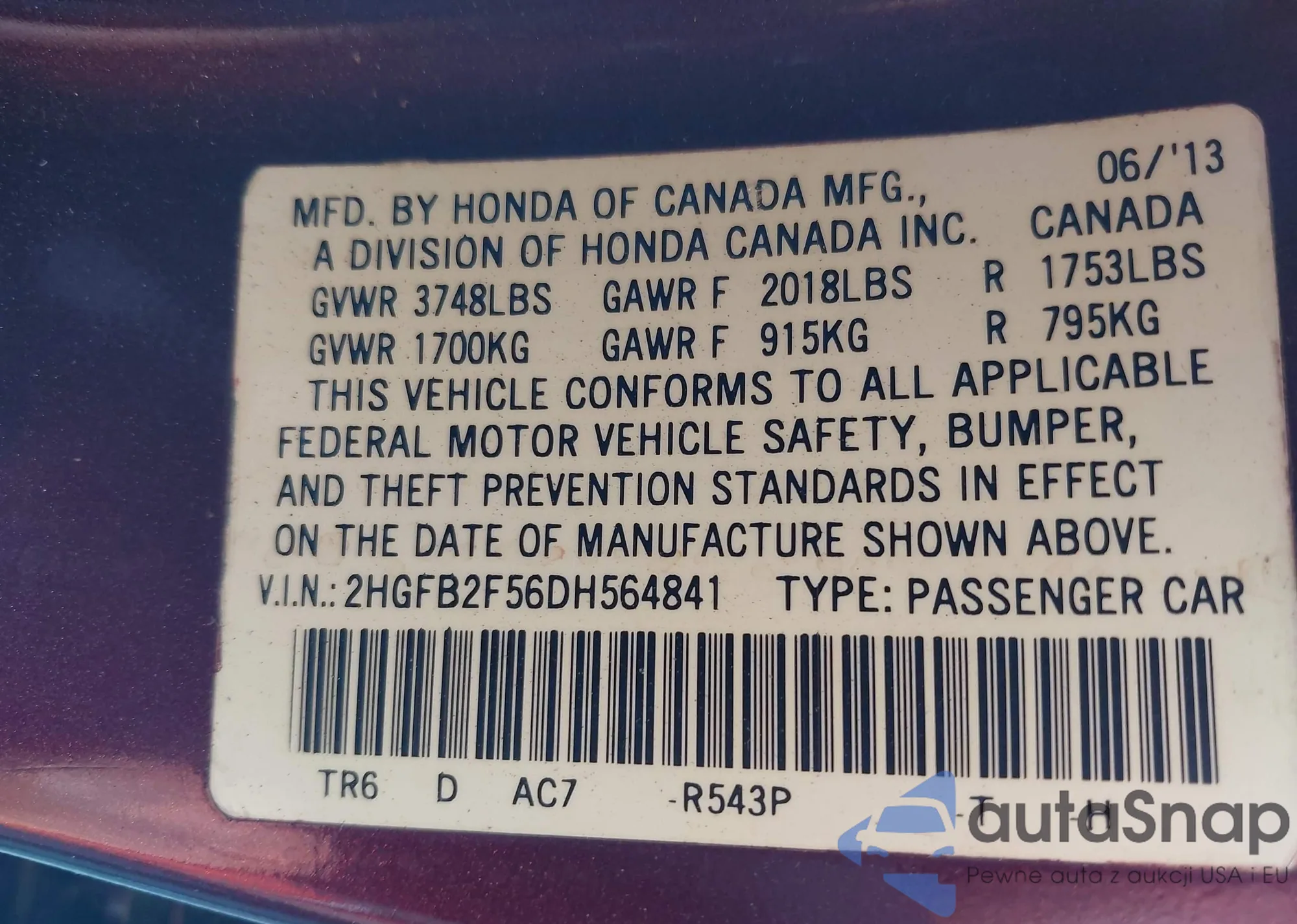 LOT: 43549099 VIN: 1HGCT1B35DA017539