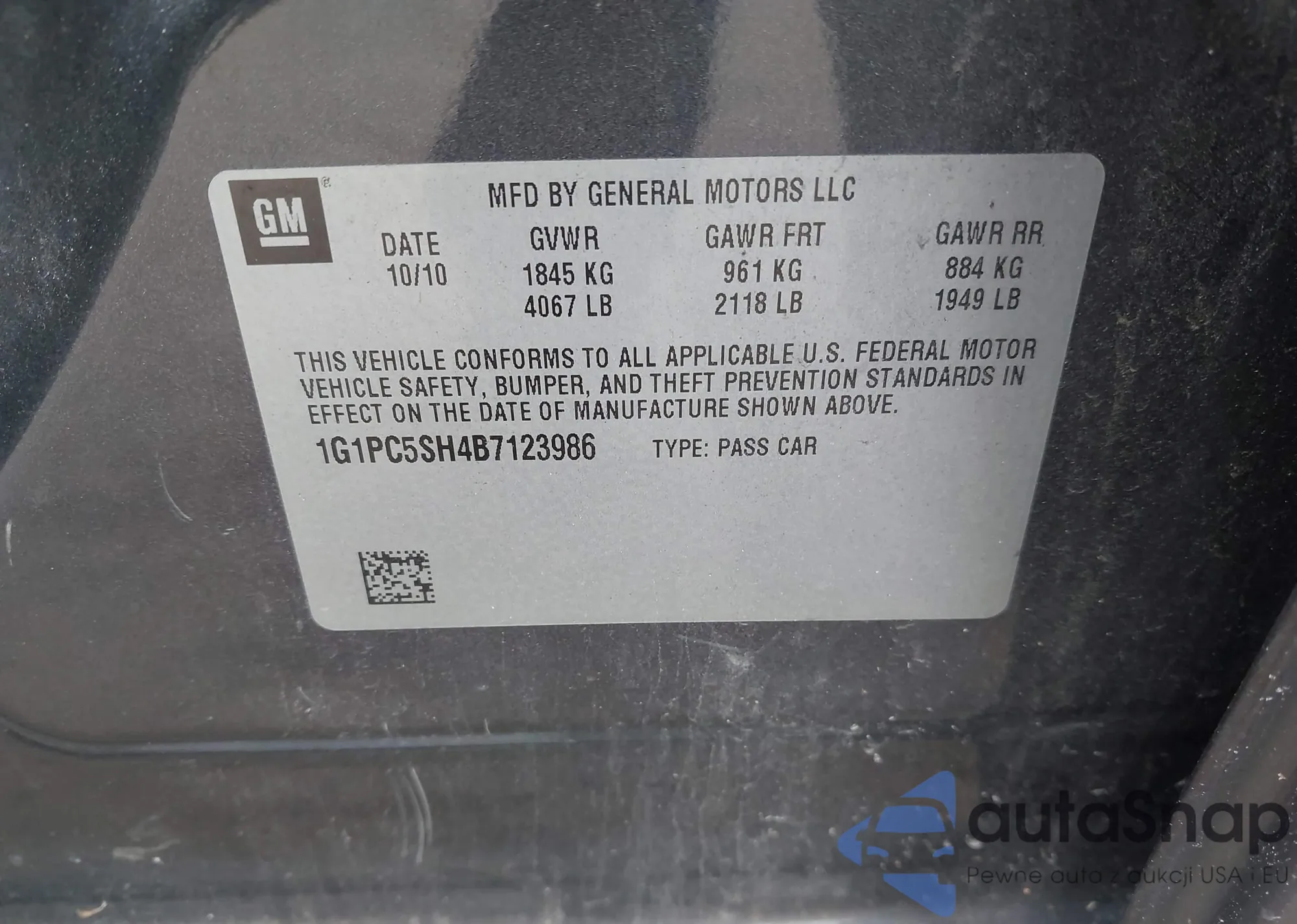 LOT: 43792446 VIN: 1G1PC5SH4B7123986