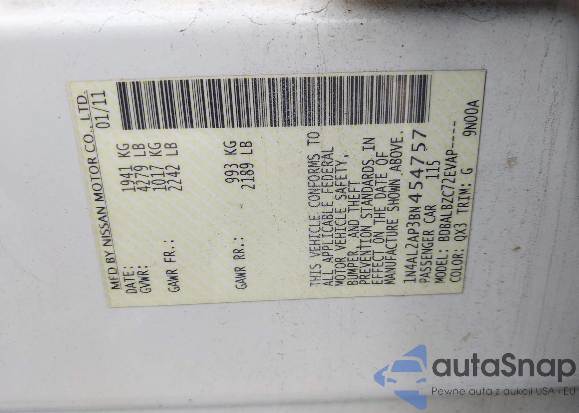 LOT: 43631582 VIN: 1N4AL2AP3BN454757