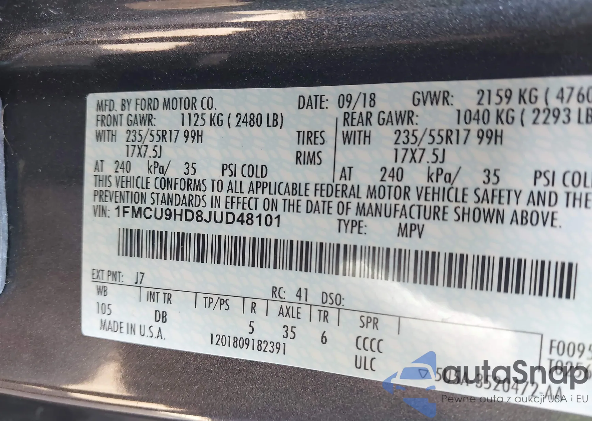 • VIN 1FMCU9HD8JUD48101