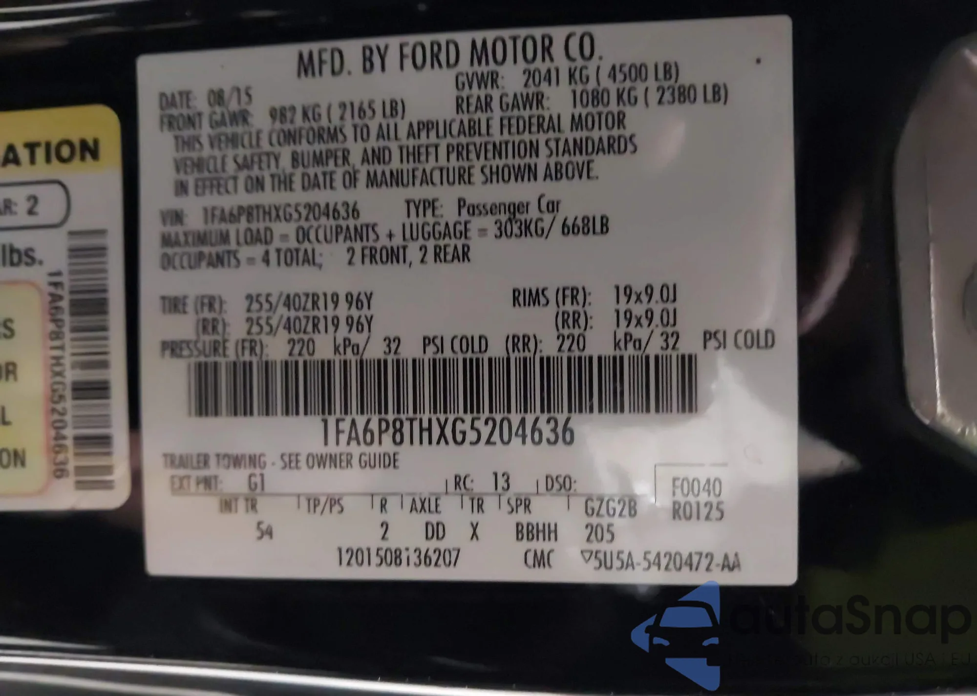 LOT: 43691621 VIN: 1FA6P8THXG5204636