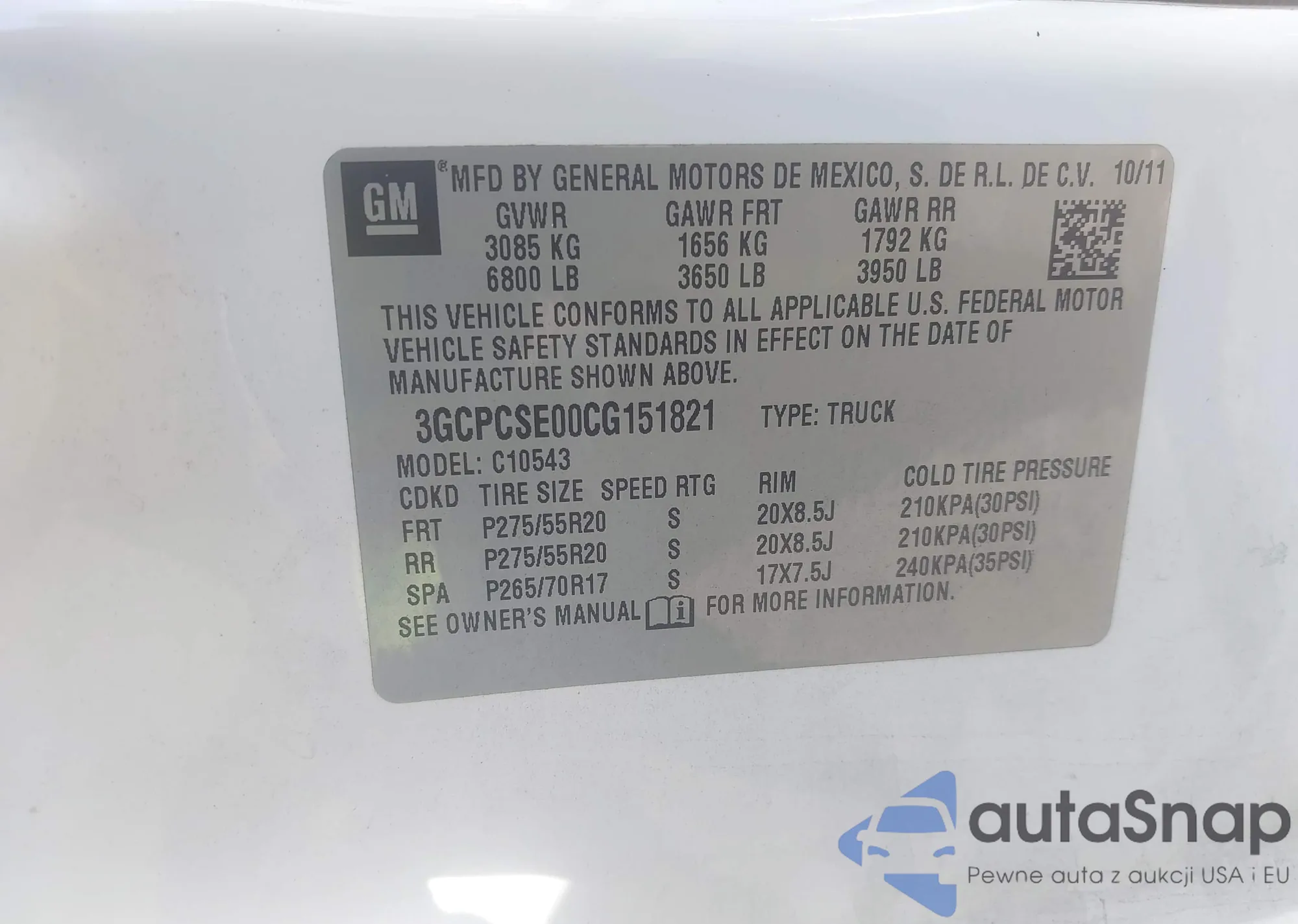 • VIN 3GCPCSE00CG151821