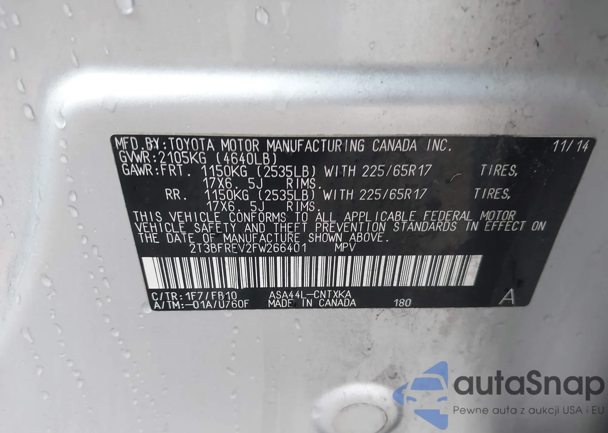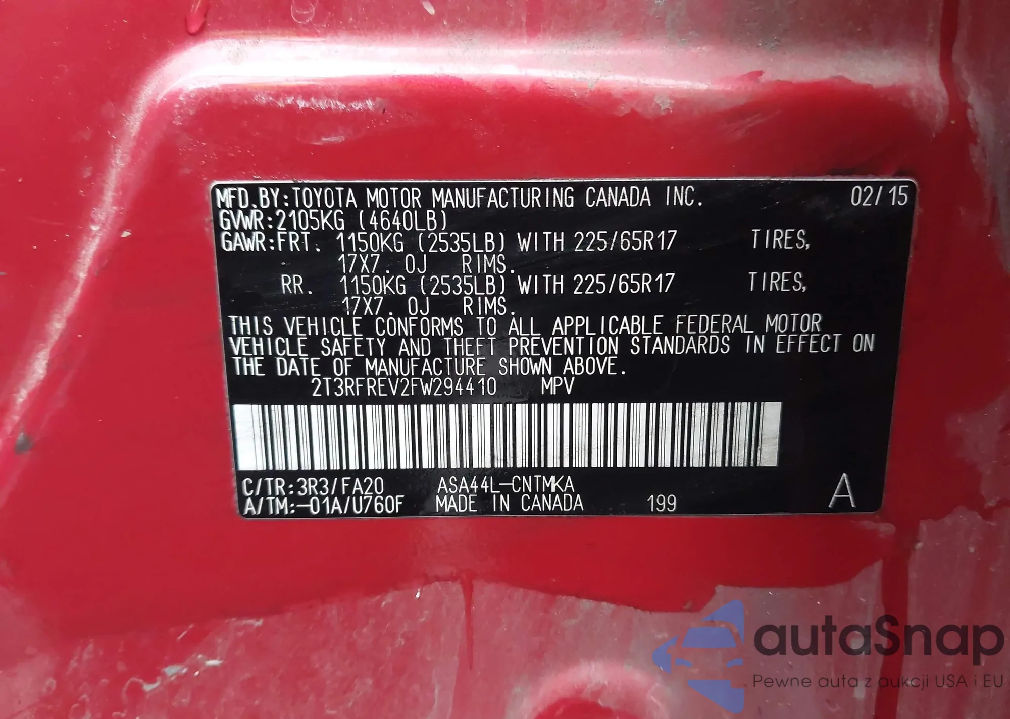LOT: 43731456 VIN: 2T3BFREV2FW266401