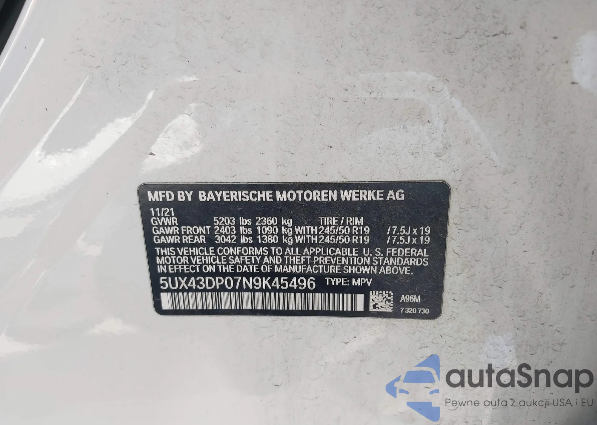 LOT: 43176238 VIN: 5UX43DP07N9K45496