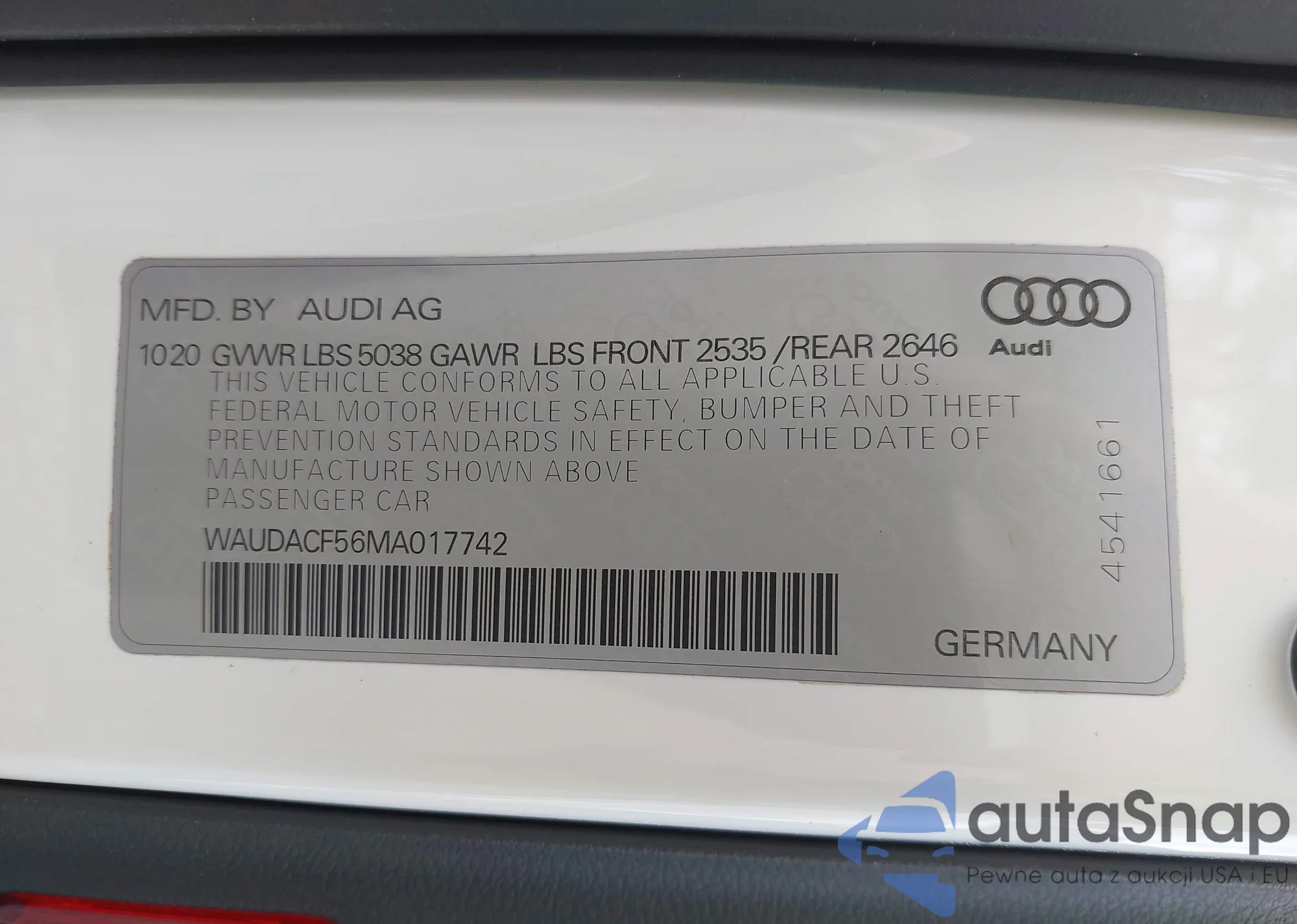 LOT: 43457948 VIN: WAUDACF56MA017742