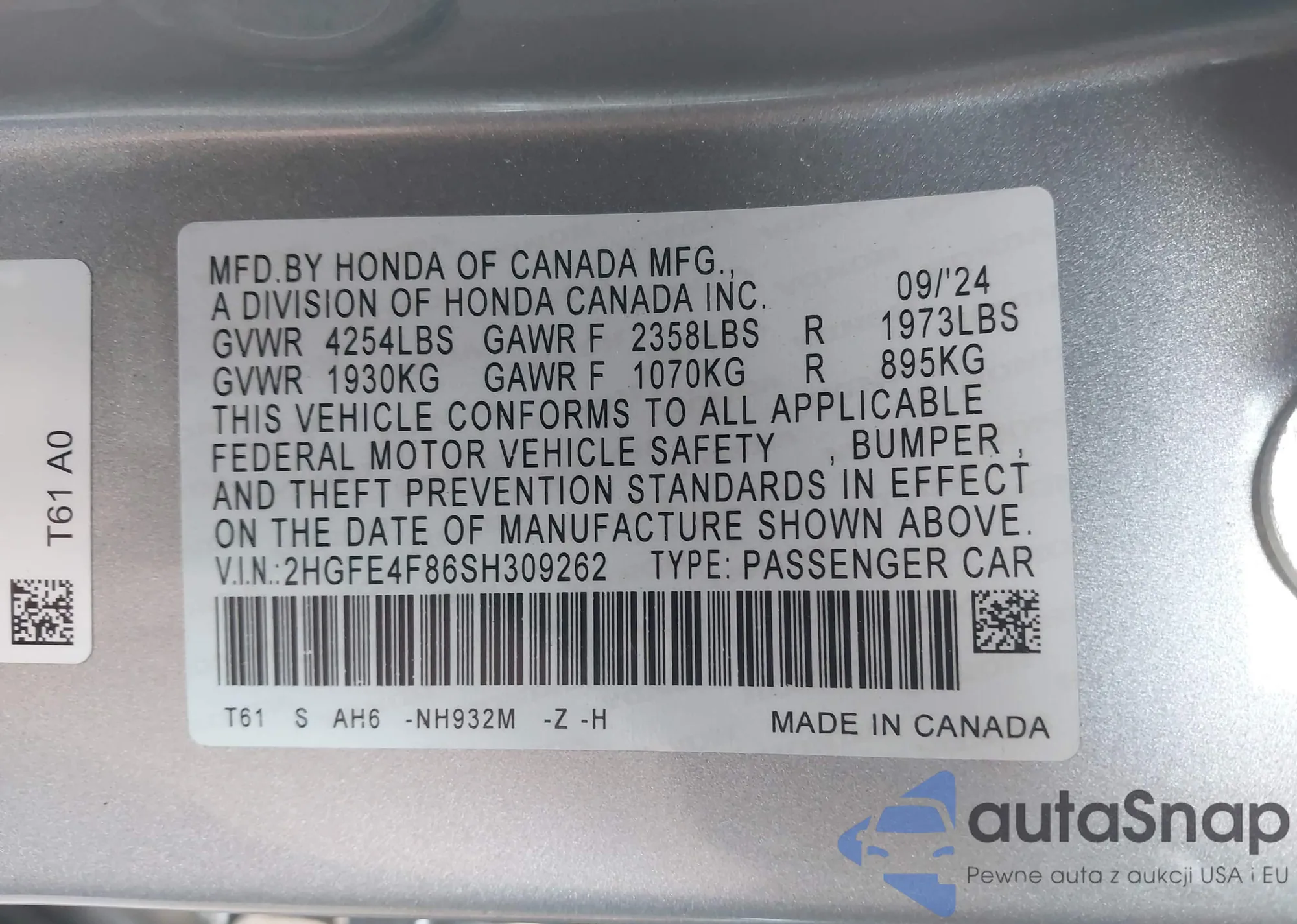 • VIN 2HGFE4F86SH309262