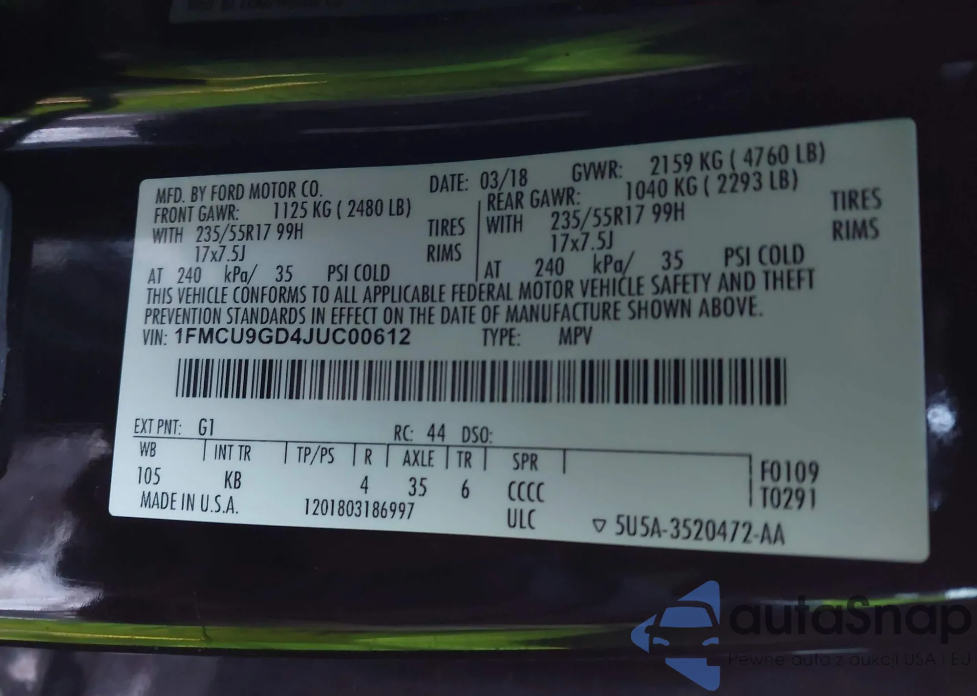 LOT: 43666982 VIN: 1FMCU9GD4JUC00612
