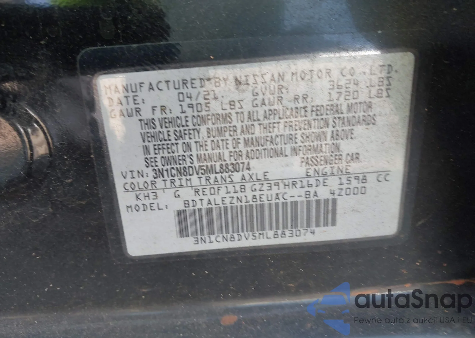 LOT: 43192944 VIN: 3N1CN8DV5ML883074