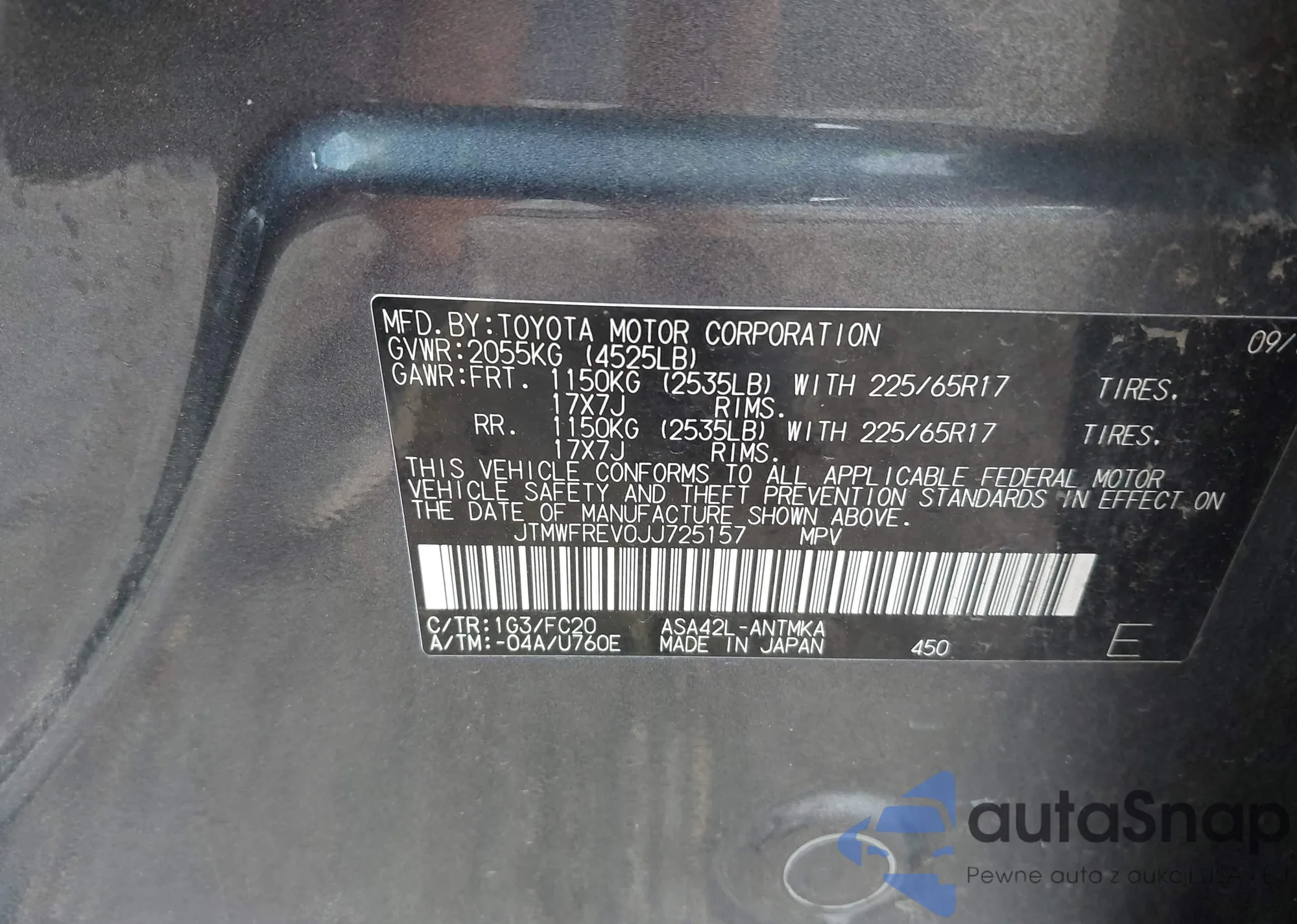 LOT: 43235526 VIN: JTMWFREV0JJ725157
