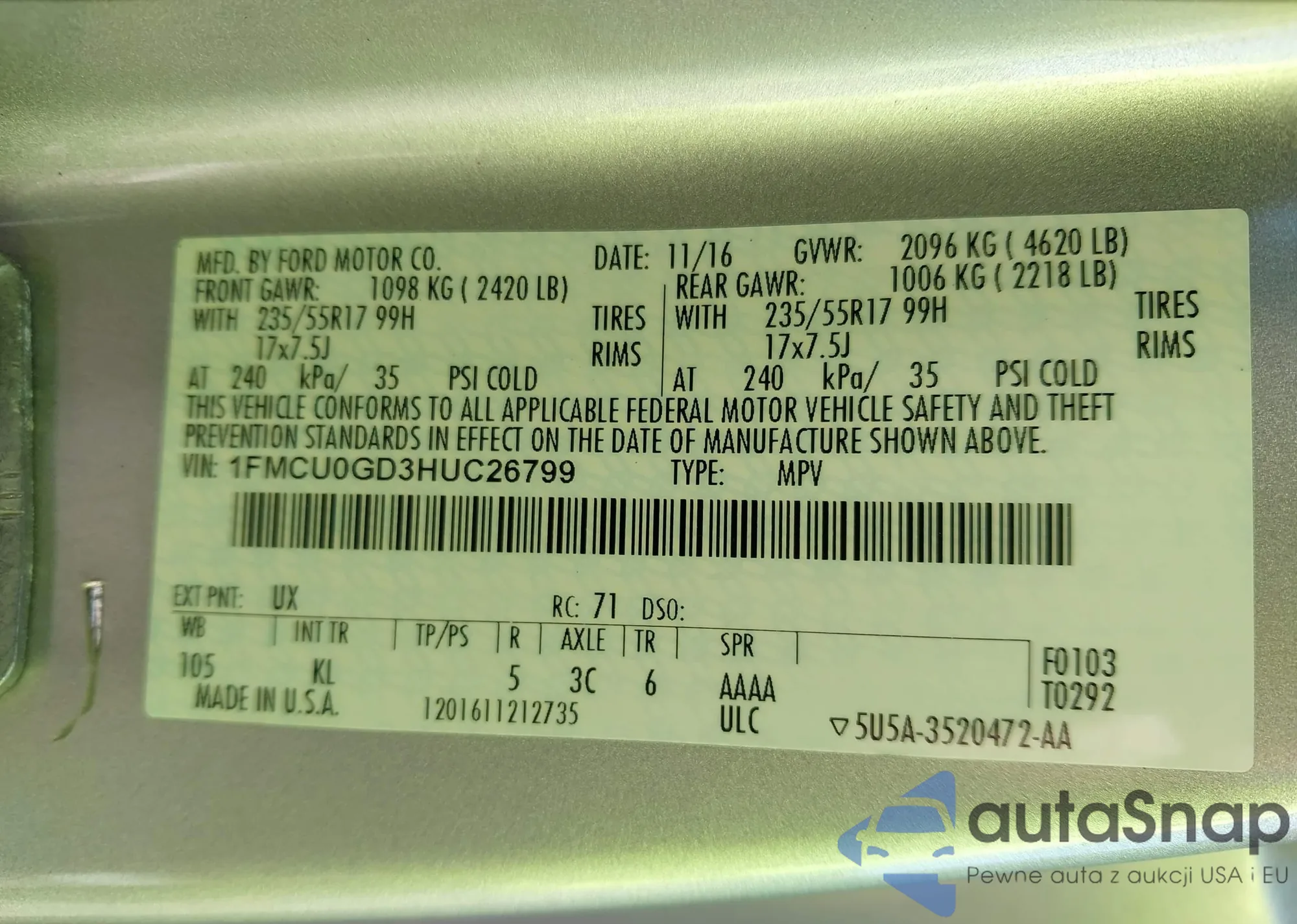 LOT: 43487846 VIN: 1FMCU0GD3HUC26799