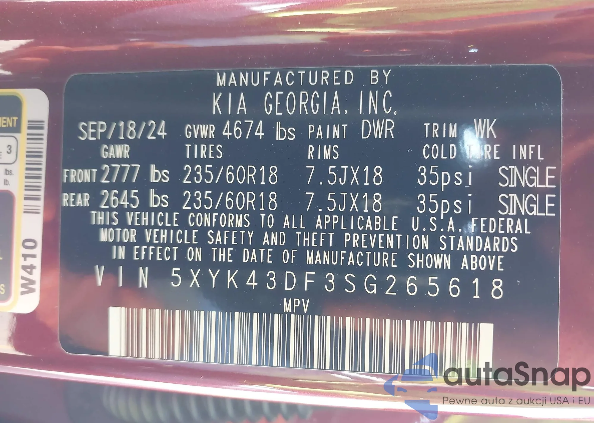 • VIN 5XYK43DF3SG265618