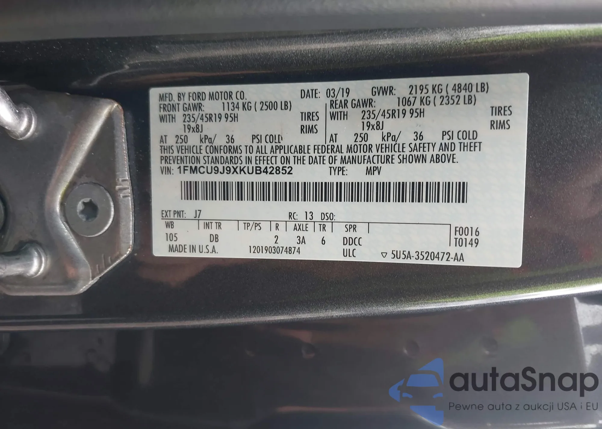 LOT: 43446112 VIN: 1FMCU9J9XKUB42852