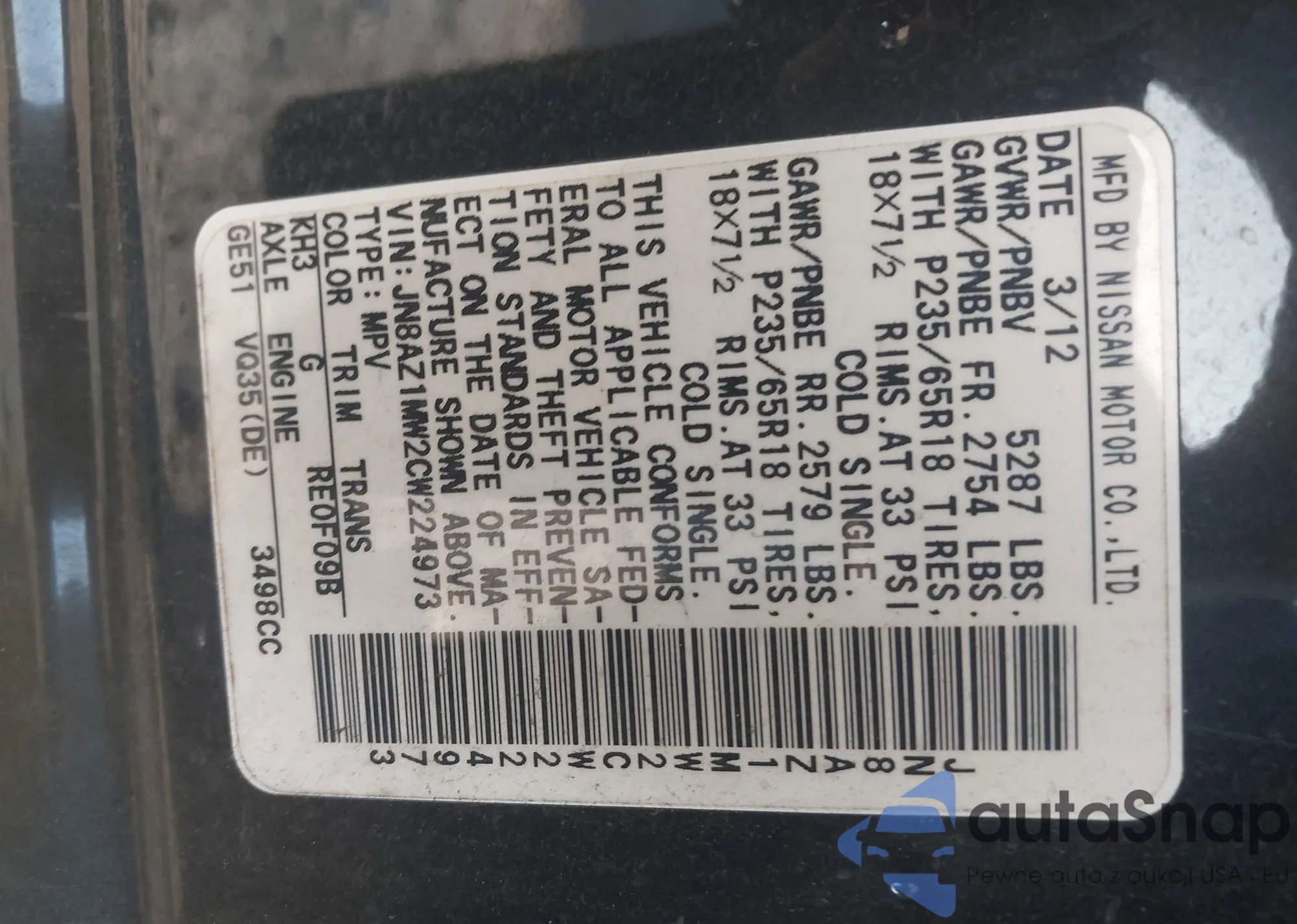 • VIN JN8AZ1MW2CW224973