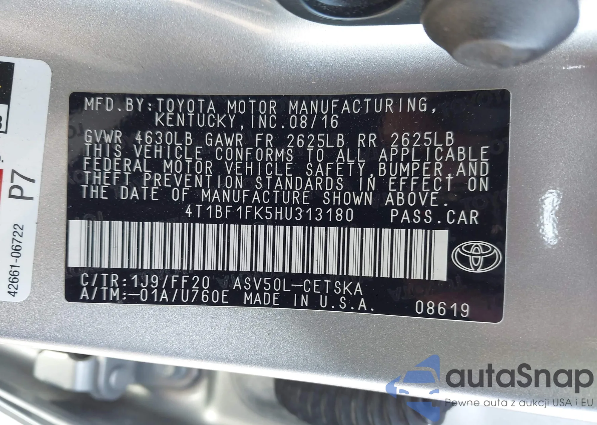 • VIN 4T1BF1FK5HU313180