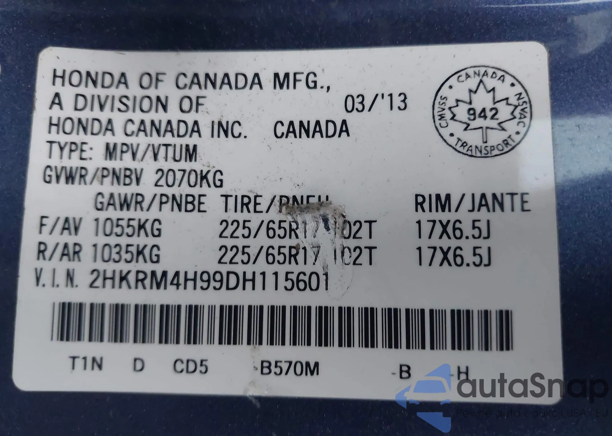 • VIN 2HKRM4H99DH115601