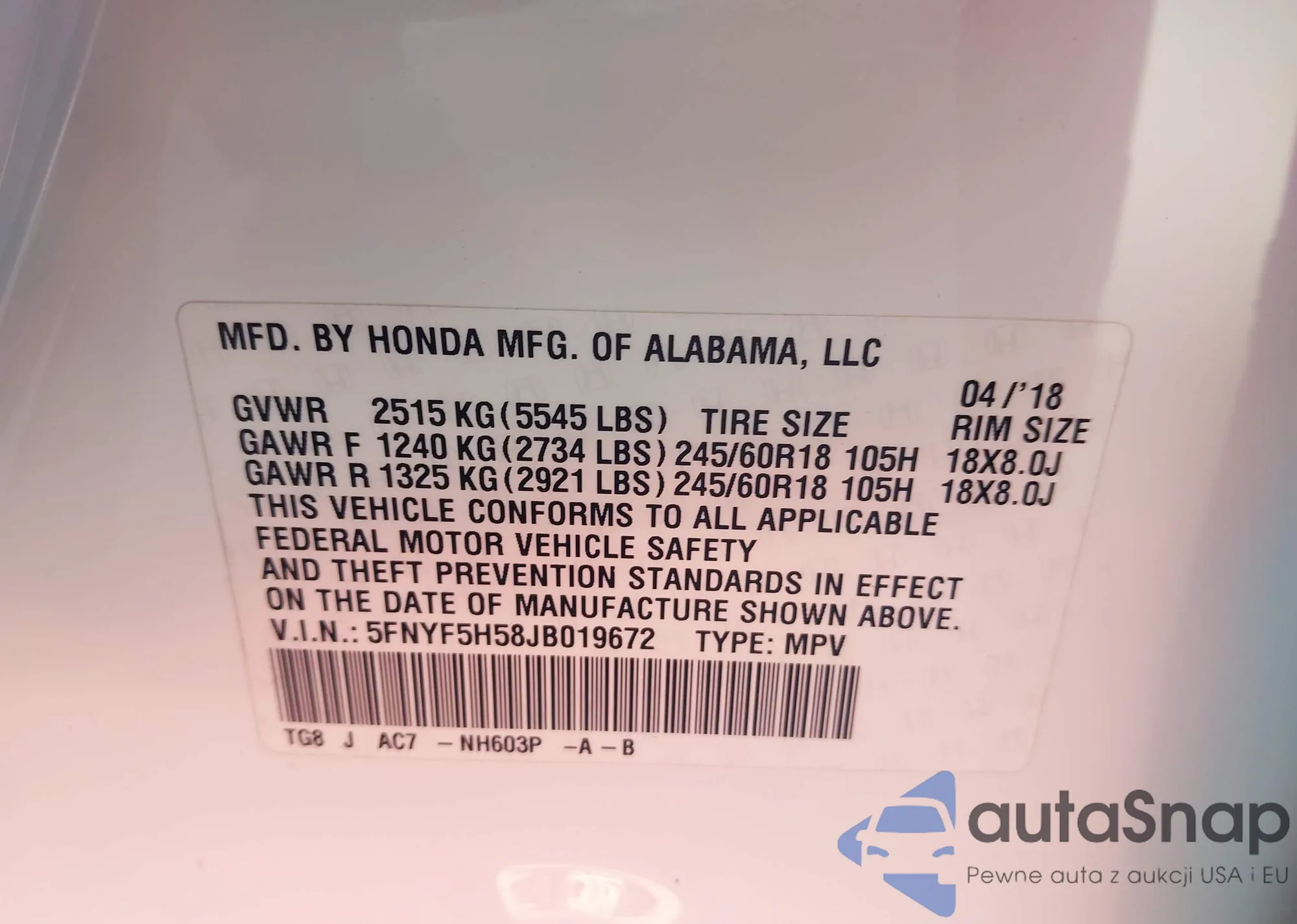 LOT: 43551755 VIN: 5FNYF5H58JB019672