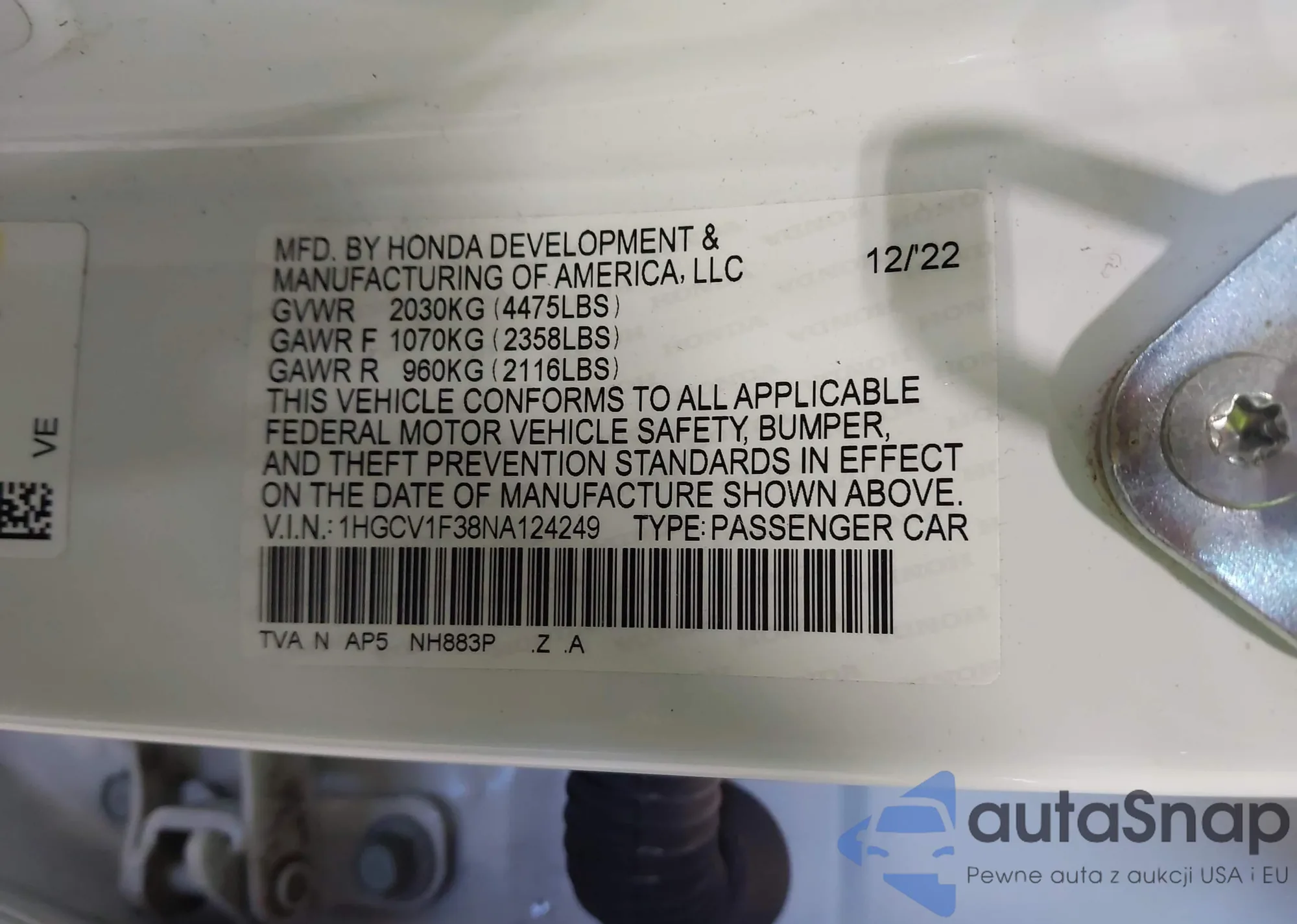 • VIN 1HGCV1F38NA124249