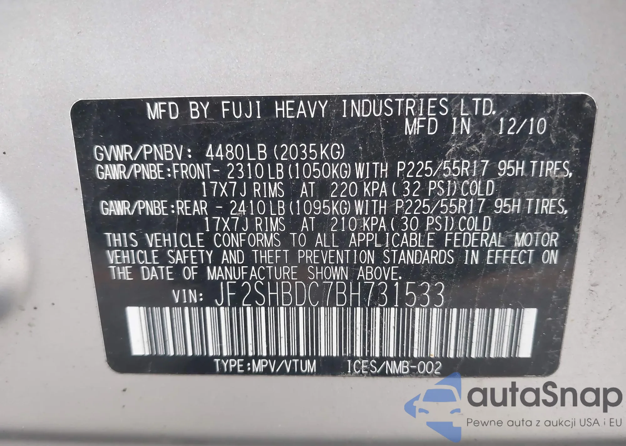 • VIN JF2SHBDC7BH731533