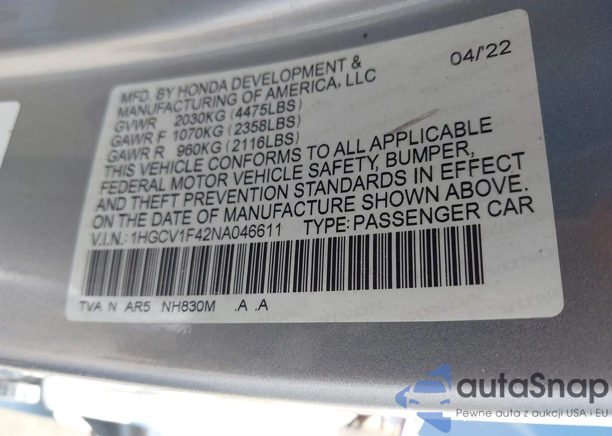 LOT: 43598506 VIN: 1HGCV1F42NA046611