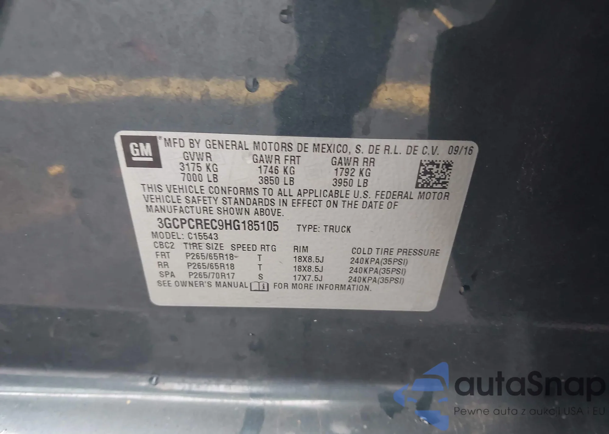 • VIN 3GCPCREC9HG185105