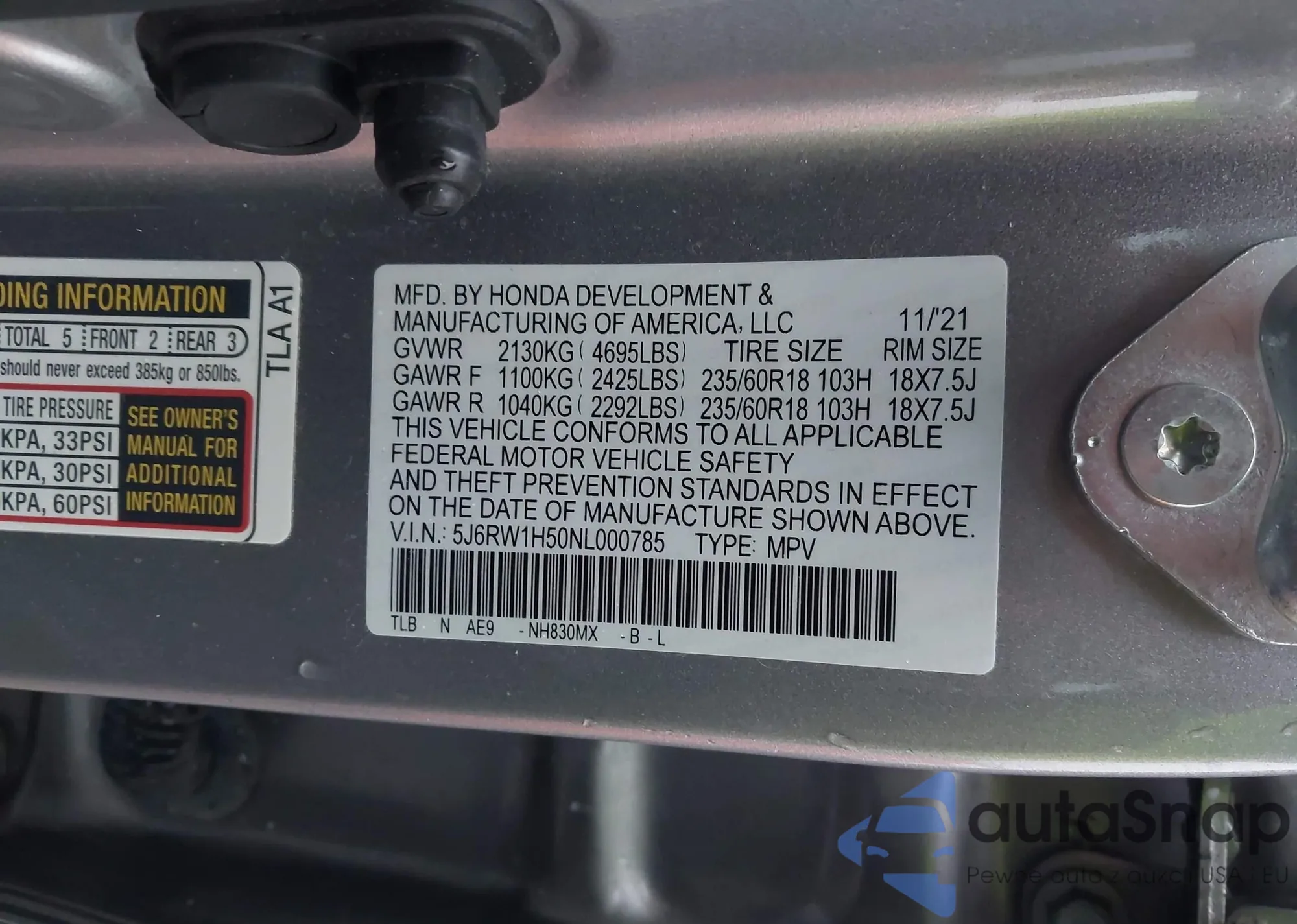 • VIN 5J6RW1H50NL000785