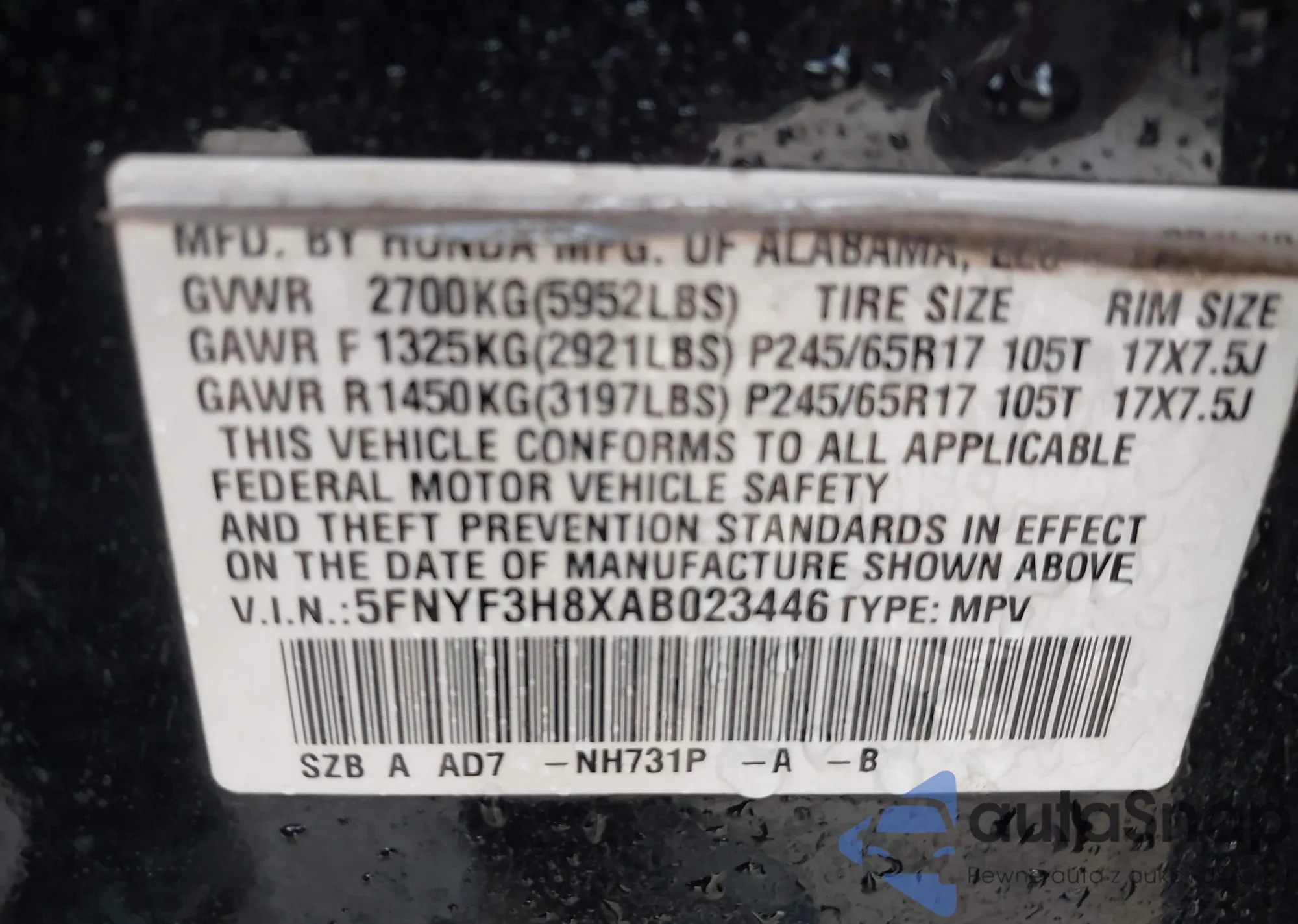 • VIN 5FNYF3H8XAB023446